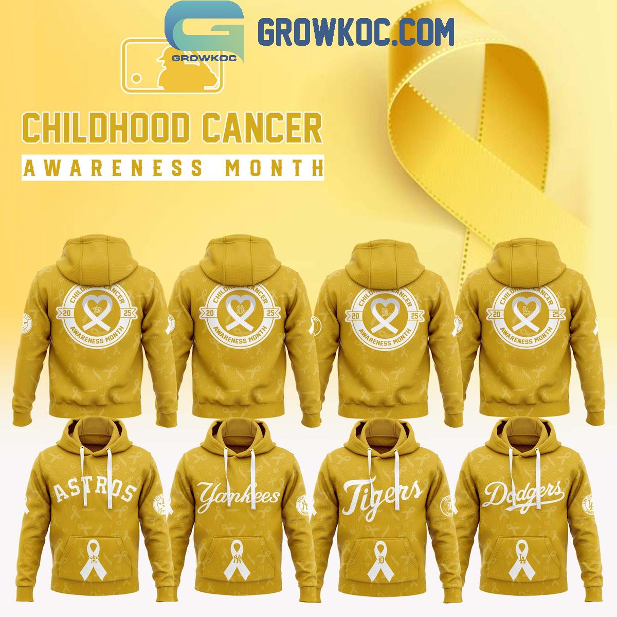 Crafted in a distinctive golden yellow, the international color of childhood cancer awareness, this hoodie immediately catches the eye. The front proudly displays iconic Major League Baseball team logos, such as the New York Yankees, Houston Astros, Detroit Tigers, and Los Angeles Dodgers, allowing fans to represent their favorite club while championing a critical cause. Below each team emblem, a prominent gold awareness ribbon is thoughtfully integrated, symbolizing solidarity and hope.