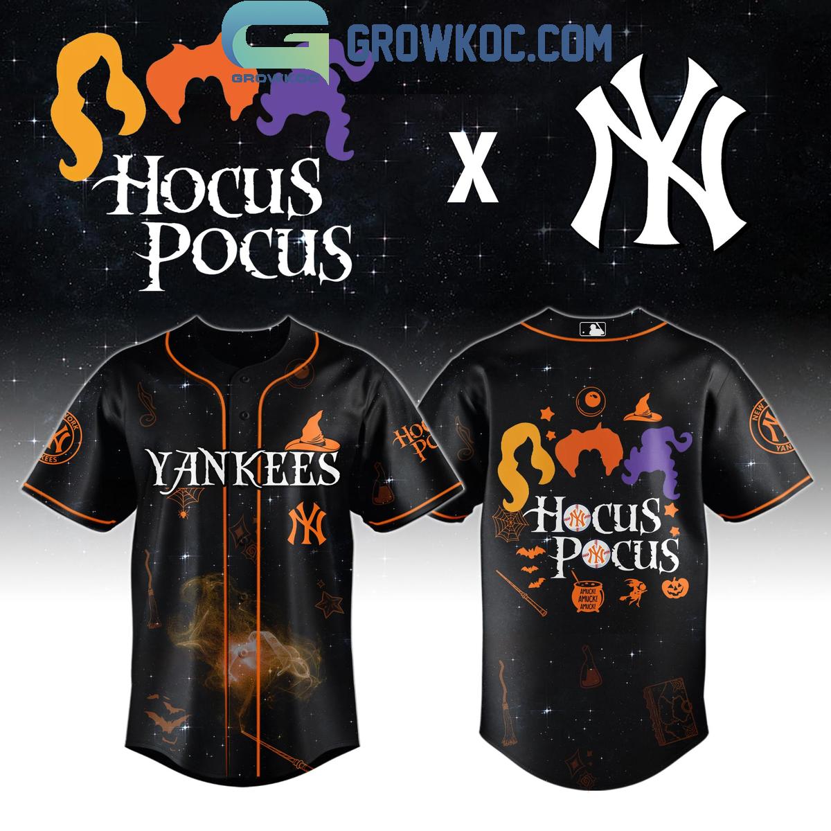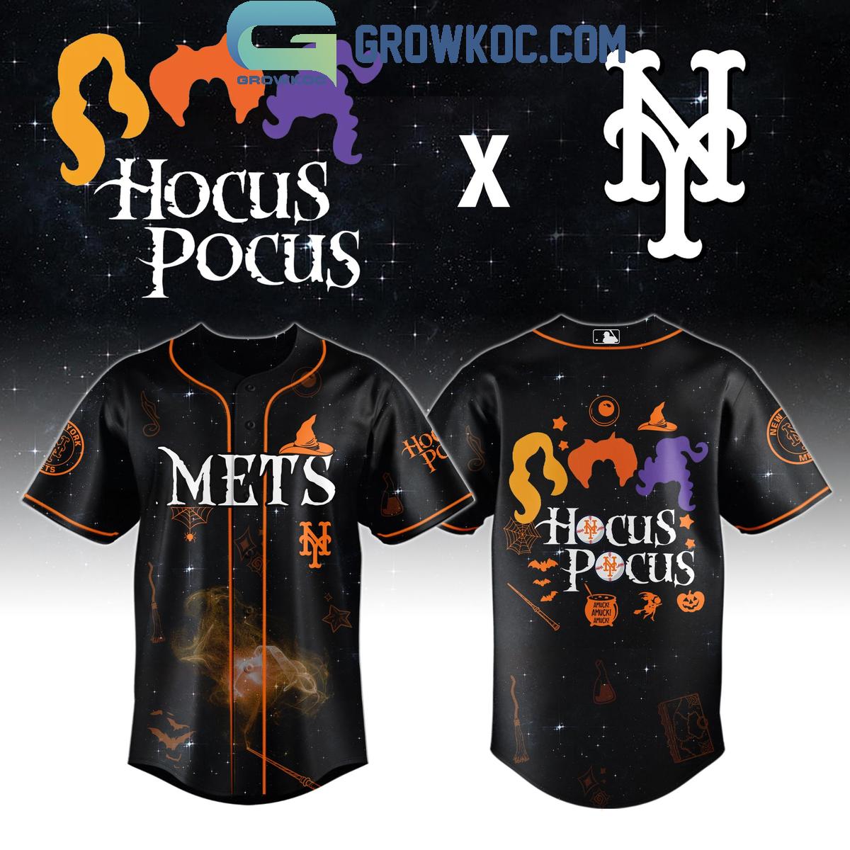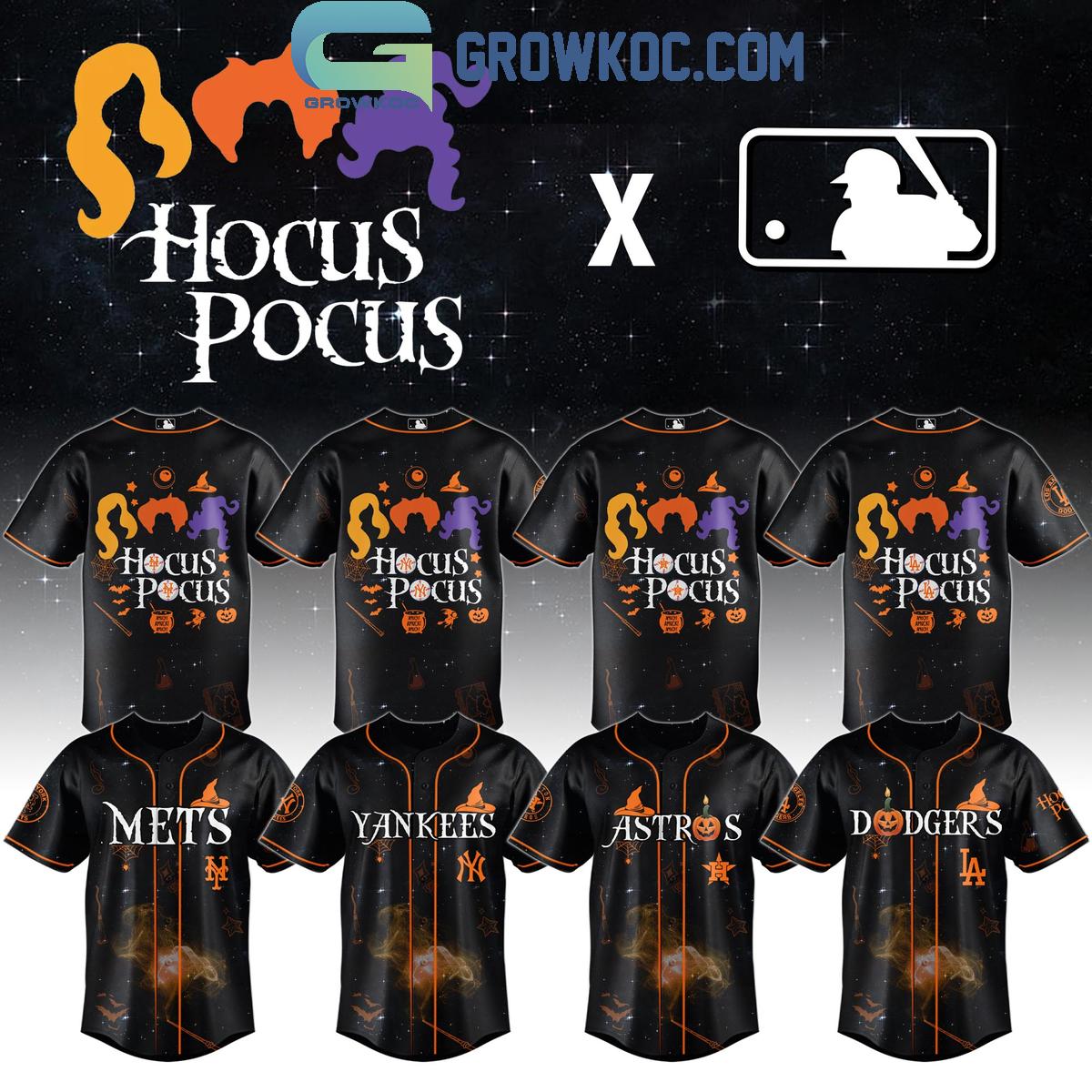 Flipping to the front, each jersey prominently displays an official MLB team name such as the New York Mets, New York Yankees, Houston Astros, or Los Angeles Dodgers, complete with their respective team logos. This front design maintains the cohesive Hocus Pocus theme, ensuring a visually unified and captivating aesthetic. The classic baseball jersey cut features orange piping detailing along the collar and sleeves, harmonizing with the overall Halloween color scheme.
