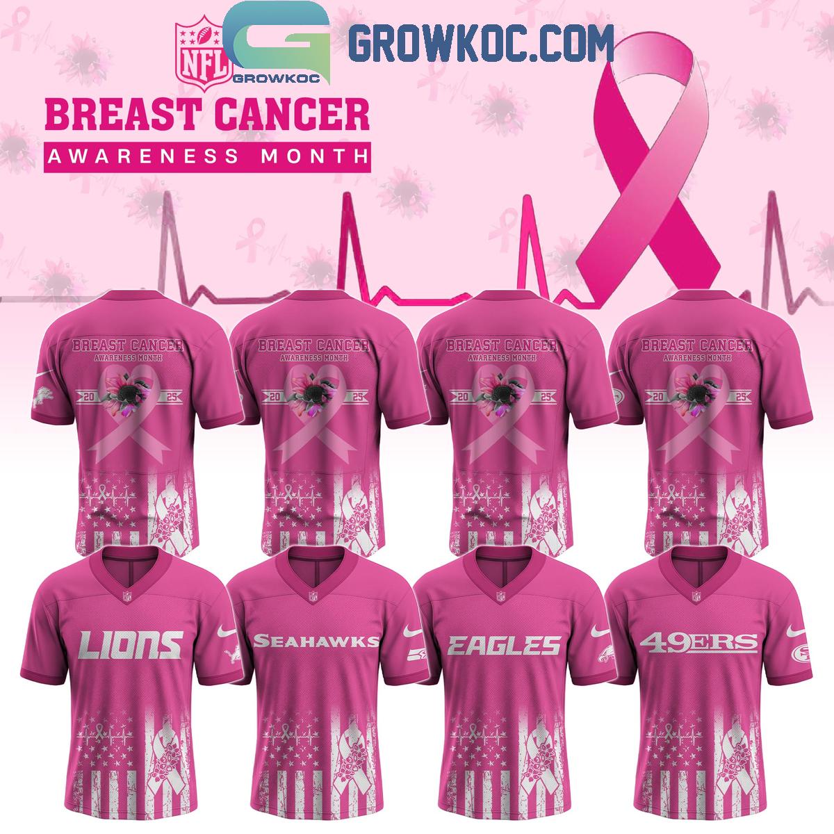 The lower half incorporates a rich tapestry of symbolic design elements. Vertical stripes create a dynamic backdrop, adorned with a repeating pattern of small, hopeful stars and miniature pink ribbons, adding depth and texture. A subtle ECG line motif weaves through the design, symbolizing the heartbeat of the community and the continuous fight for health. The front proudly showcases distinctive logos from various NFL teams, including the Detroit Lions, Seattle Seahawks, Philadelphia Eagles, and San Francisco 49ers, allowing fans to represent their favorite franchise while championing a unified message of support.