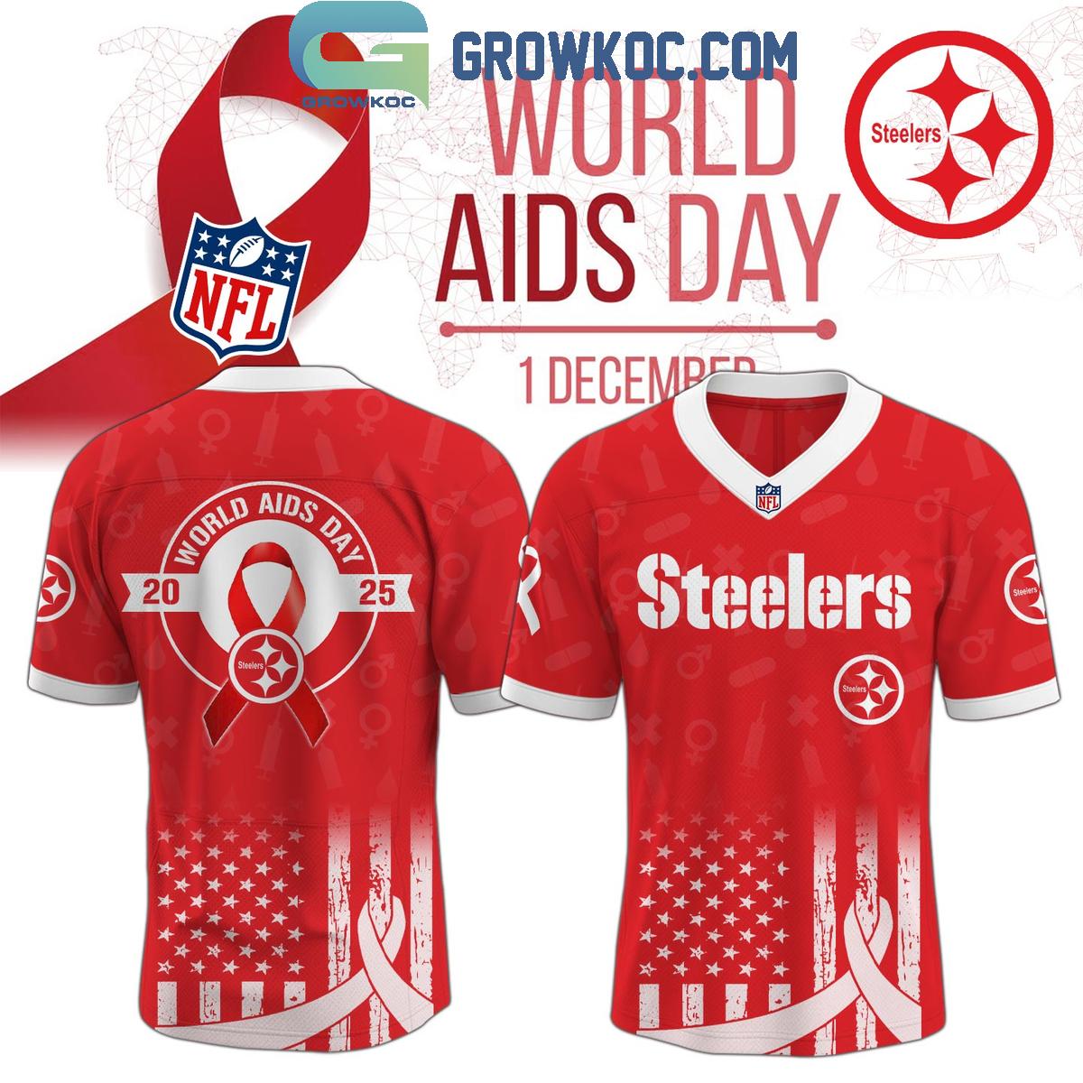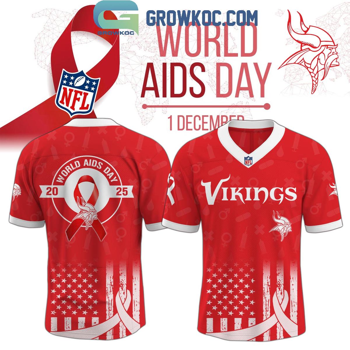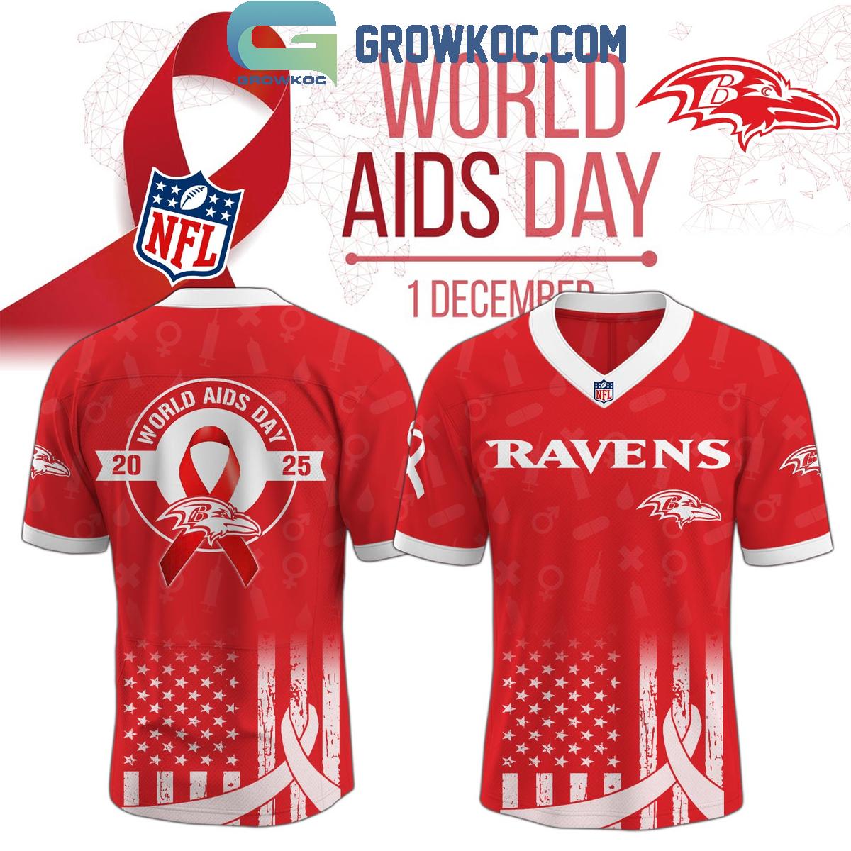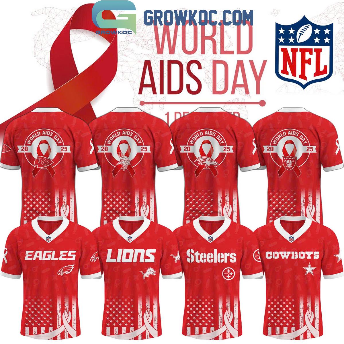 The reverse side of the jersey truly elevates its purpose. A prominent circular emblem, clearly marked "WORLD AIDS DAY 20 25," frames the respective team's logo, seen for teams like the Kansas City Chiefs, Baltimore Ravens, and Las Vegas Raiders. This powerful central design is overlaid with the universally recognized red ribbon, a symbol of solidarity and support for those affected by HIV/AIDS. The lower half of the jersey is adorned with a dynamic pattern resembling stars and stripes, further integrated with multiple red ribbons, creating a visually impactful and meaningful statement.