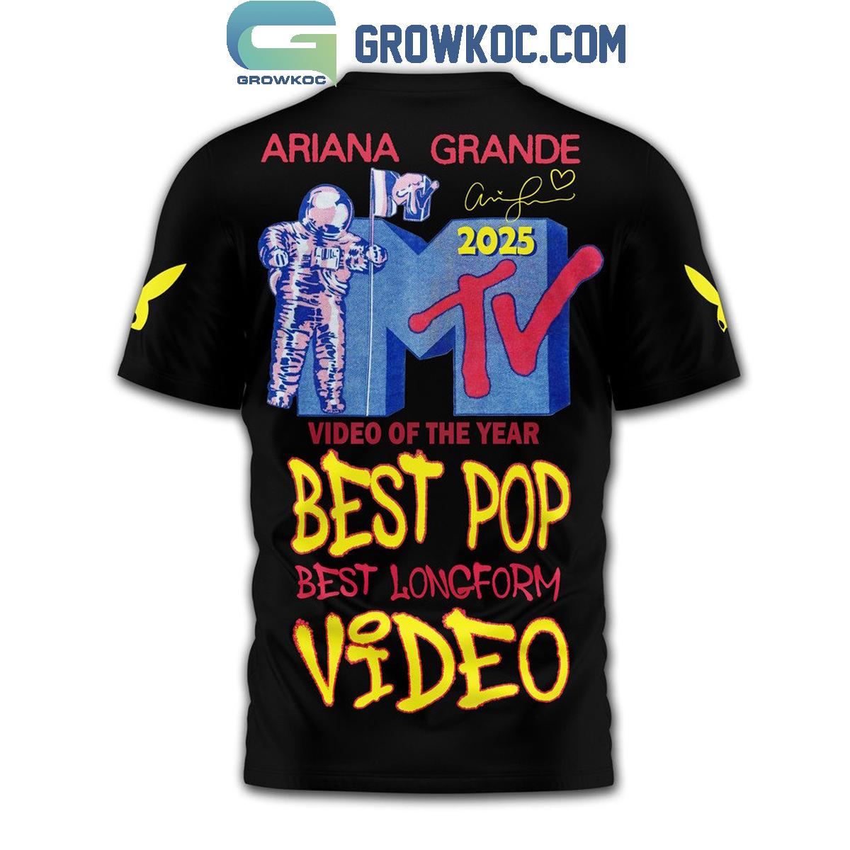 Turn the shirt around, and the back unveils an even richer narrative. "ARIANA GRANDE" is boldly printed at the top, accompanied by a charming hand-drawn heart and a signature-like detail, possibly commemorating a special moment envisioned for 2025. The iconic MTV Moon Person, a symbol of musical excellence, stands proudly beside the recognizable 3D MTV logo. Below this, the shirt proudly declares "VIDEO OF THE YEAR," further highlighting "BEST POP" and "BEST LONGFORM VIDEO" in a dynamic, handwritten-style yellow font, celebrating her prowess in the music video landscape.