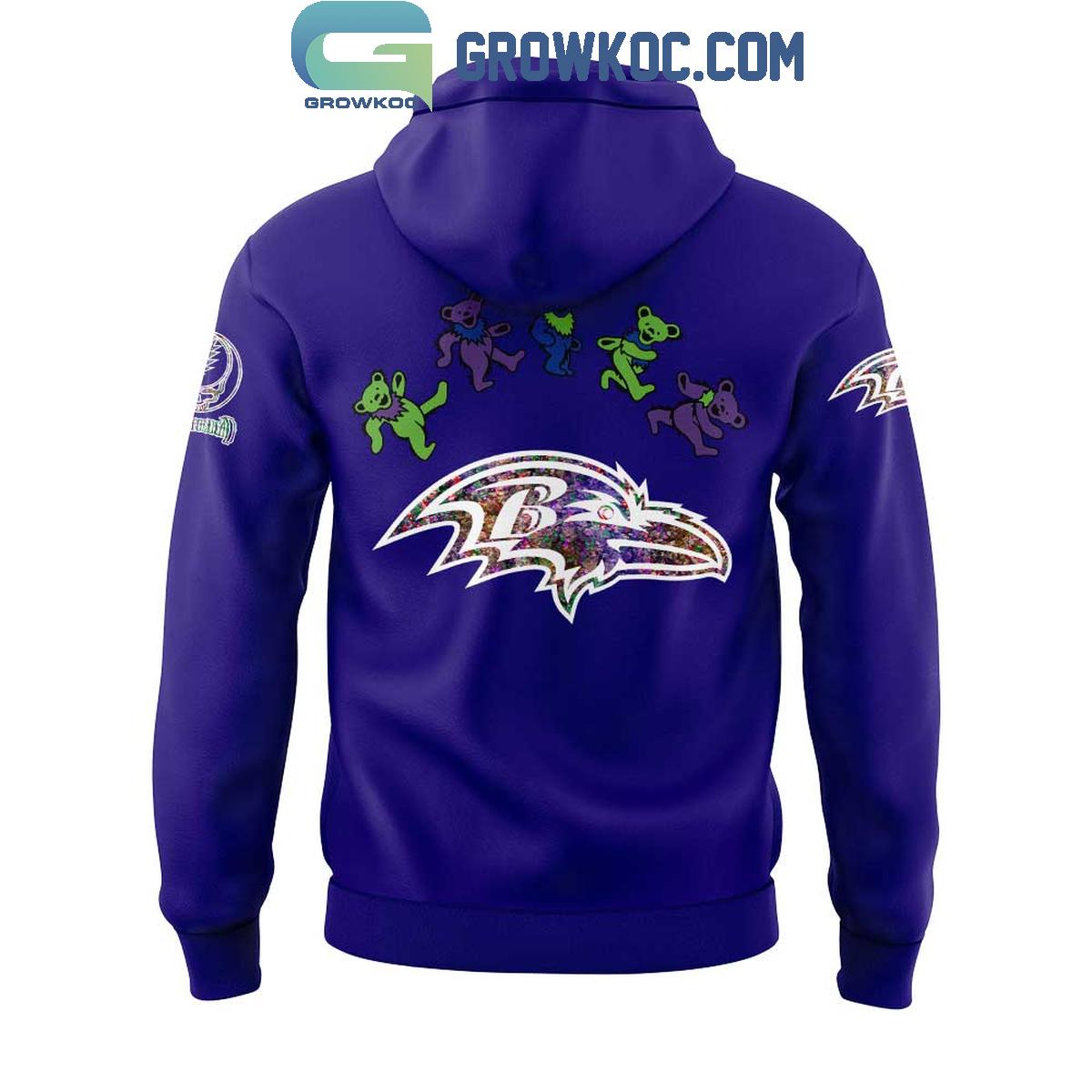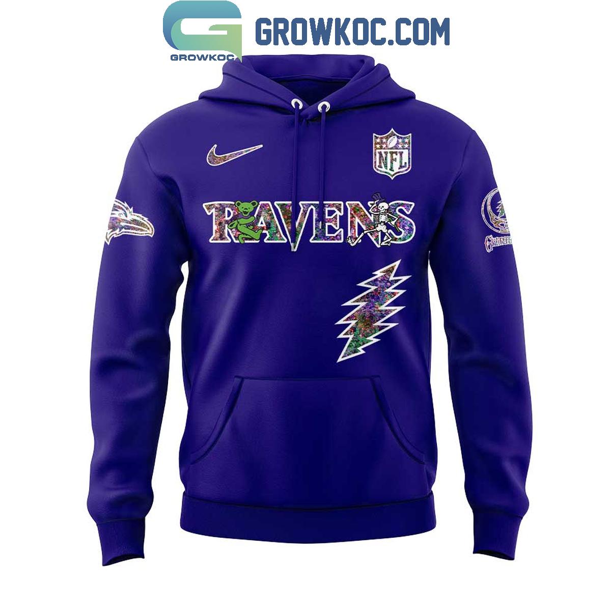 Crafted in a vibrant, rich purple, this hoodie immediately conveys team pride while offering a unique artistic twist. It proudly features authentic NFL and Nike branding, ensuring superior quality and an official feel. The front boldly displays the "RAVENS" lettering, each character intricately filled with classic Grateful Dead-inspired patterns, creating a mesmerizing visual depth. This is powerfully complemented by a striking Steal Your Face lightning bolt, symbolizing the electrifying fusion of these two cultural titans.