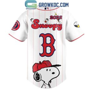 Flipping the jersey reveals a thoughtful tribute. "Snoopy" is presented in vibrant red script, boldly marked with "2025" above, commemorating this special event. Below, the iconic Red Sox "B" commands attention, anchored by a delightful illustration of Snoopy sporting a Red Sox cap, poised for action.