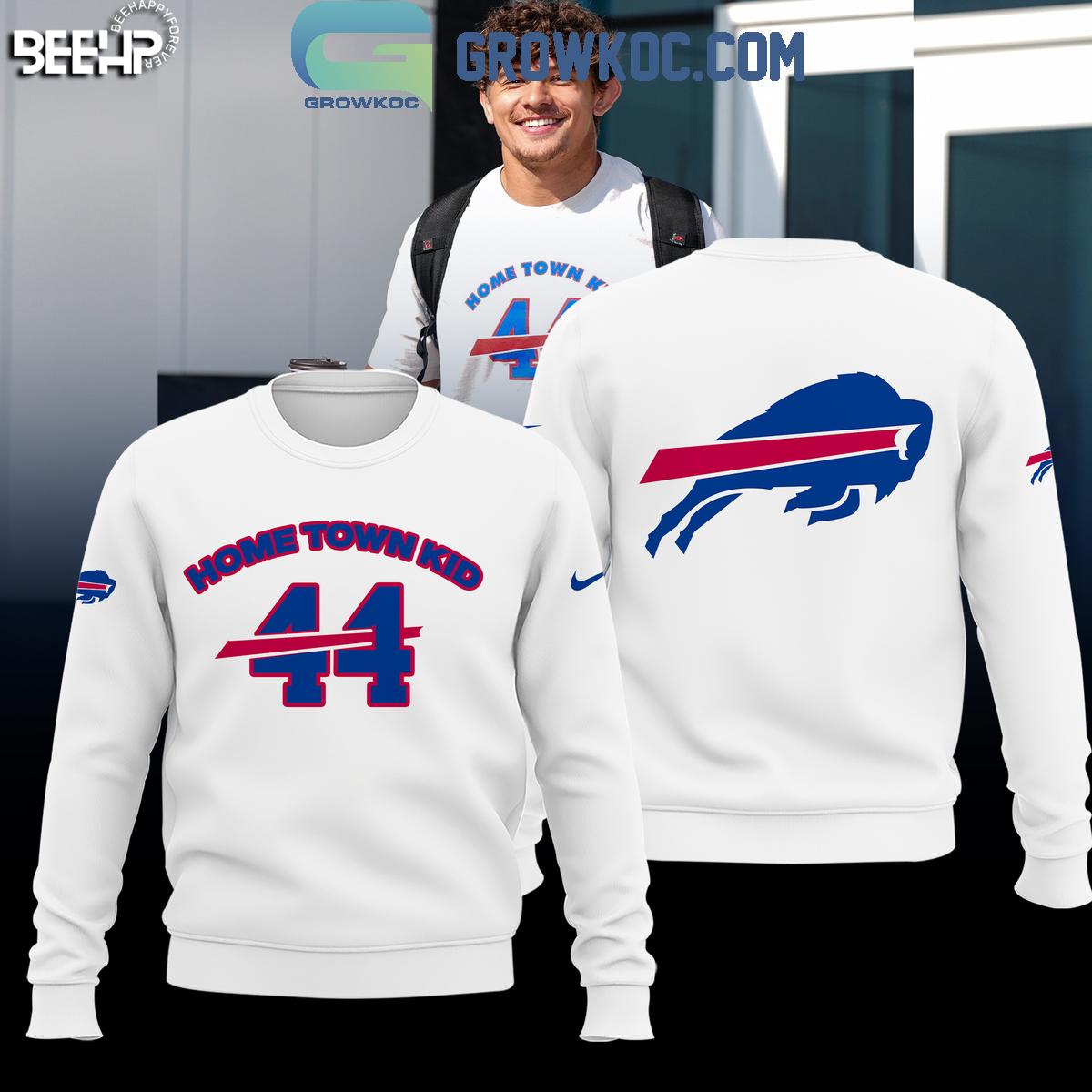 The crisp white base provides a clean canvas for the vibrant graphics. Front and center, the bold "HOME TOWN KID" lettering, rendered in striking red and blue, sits proudly above the distinctive number "44" – a powerful symbol for any fan. This design resonates with the grassroots energy of the Bills Mafia, celebrating those who grew up cheering for their team from day one.