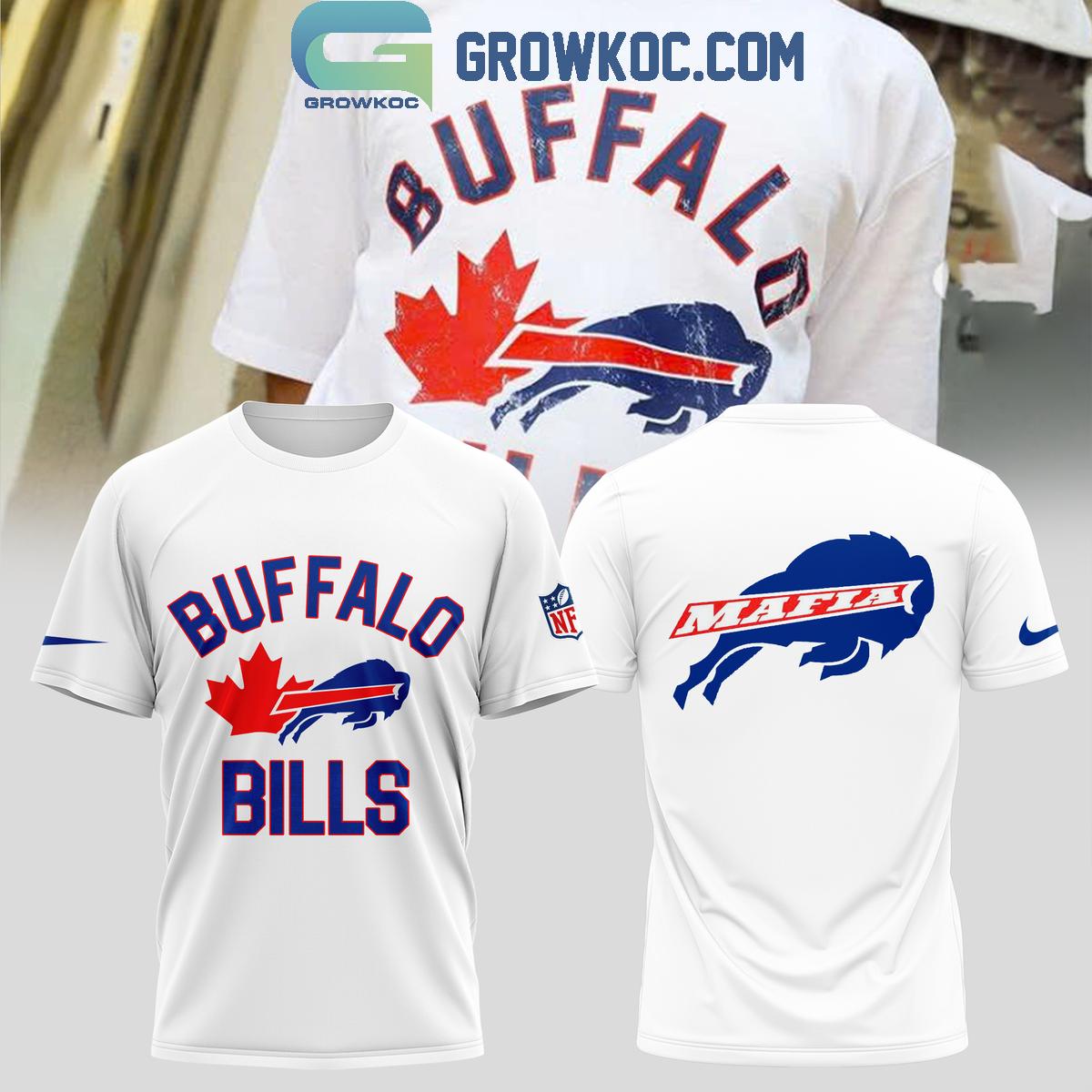 The front of this crisp white hoodie immediately captures attention with "BUFFALO" prominently displayed in bold blue lettering. Below it, a vibrant red maple leaf emblem is artfully integrated, followed by "BILLS" in matching blue. This striking design element elegantly fuses the Buffalo Bills identity with a symbol often associated with Canada and its beloved Toronto Maple Leafs, creating a harmonious visual narrative for fans on both sides of the border.