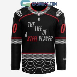 This visually striking jersey features bold graphics and design elements that capture the essence of both the Chicago Steel hockey team and the themes present in "The Life Of A Showgirl." The details are meticulously crafted, ensuring a high-quality garment that stands out from the crowd. The overall aesthetic makes it suitable for wearing at hockey games, concerts, or simply as a distinctive addition to your everyday wardrobe.