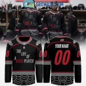 This visually striking jersey features bold graphics and design elements that capture the essence of both the Chicago Steel hockey team and the themes present in "The Life Of A Showgirl." The details are meticulously crafted, ensuring a high-quality garment that stands out from the crowd. The overall aesthetic makes it suitable for wearing at hockey games, concerts, or simply as a distinctive addition to your everyday wardrobe.