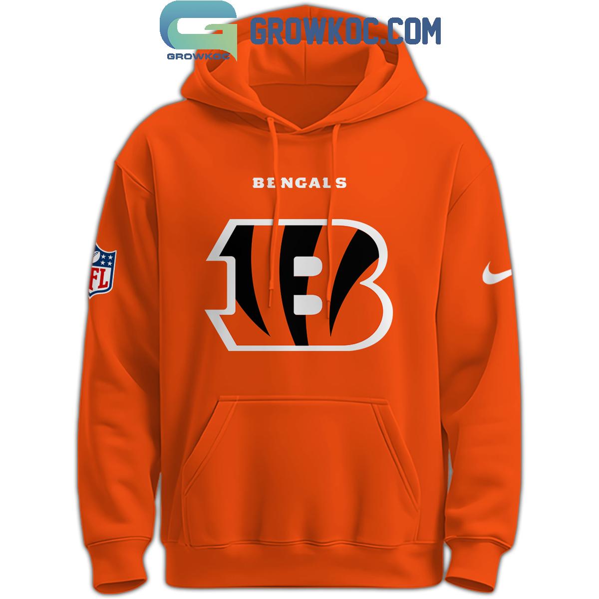 The front proudly showcases the iconic Bengals identity, featuring the bold "BENGALS" wordmark prominently displayed above the instantly recognizable striped "B" logo, all set against the team's signature orange hue. Authenticity and superior quality are guaranteed through the inclusion of the official Nike swoosh and NFL shield logo, signifying a fully licensed product designed to meet the highest standards of fan apparel. A practical kangaroo pocket offers both convenience and a classic hoodie silhouette.