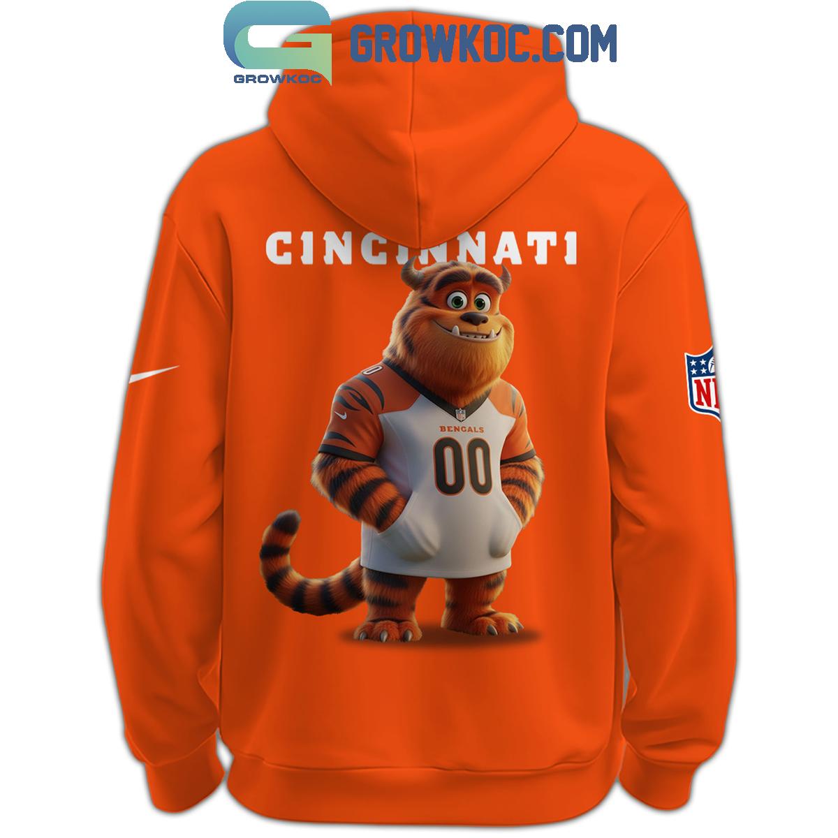 Turning to the back reveals the captivating essence of the "Monsters" collaboration: a spirited, cartoon tiger character brought to life with vibrant detail. This charming monster proudly sports a Bengals jersey emblazoned with "00," positioned beneath the "CINCINNATI" text, creating an exclusive graphic that celebrates the team's spirit with a delightful twist. It's a design perfect for fans who appreciate a fresh interpretation of their beloved team's iconography, making this hoodie a true collector's item.