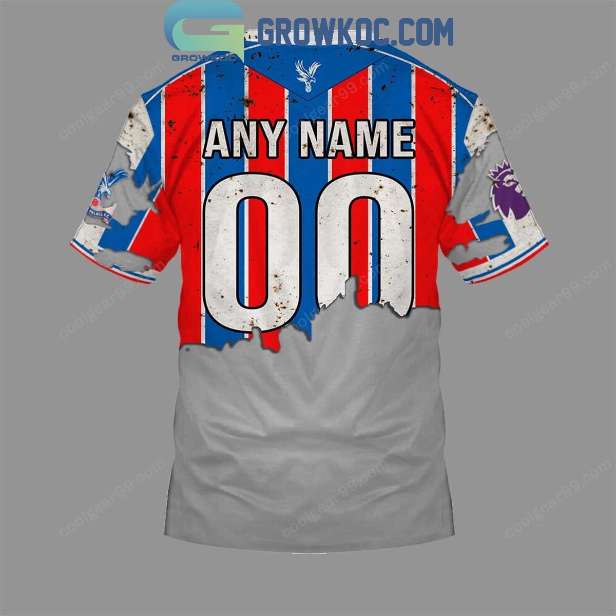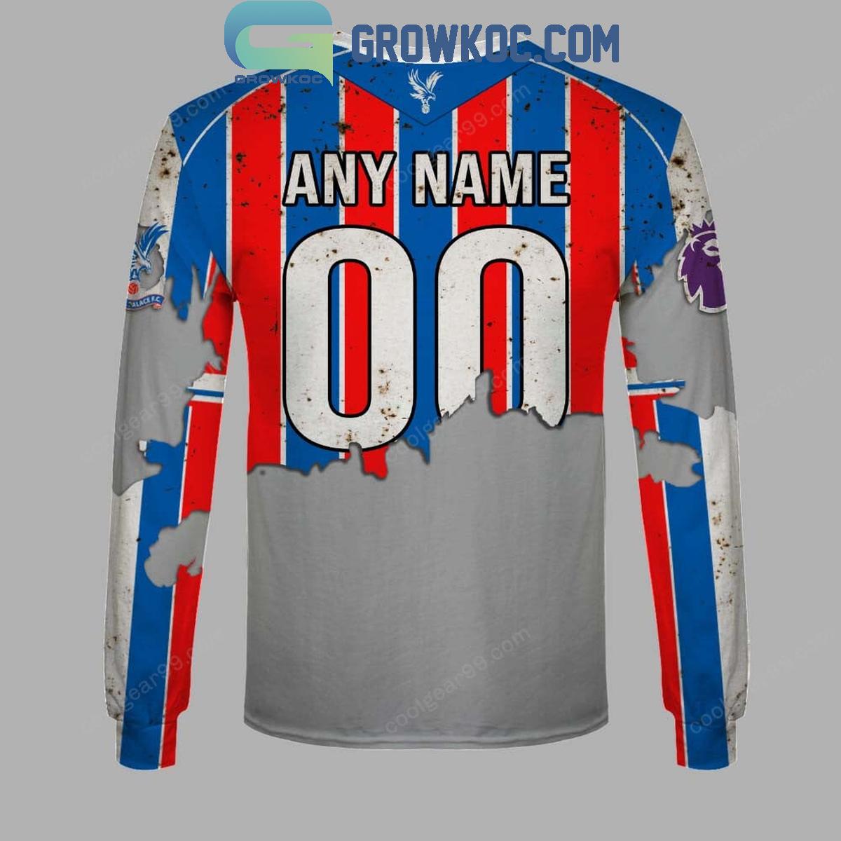 Crystal Palace F.C. branding is intricately woven into this chilling narrative. The iconic eagle crest and signature red and blue stripes are prominently displayed across the shoulders and sleeves, but with a twist – they appear distressed, torn, and ravaged, as if touched by the undead themselves. This thoughtful detailing elevates the design beyond simple fan merchandise, creating an immersive, themed experience.