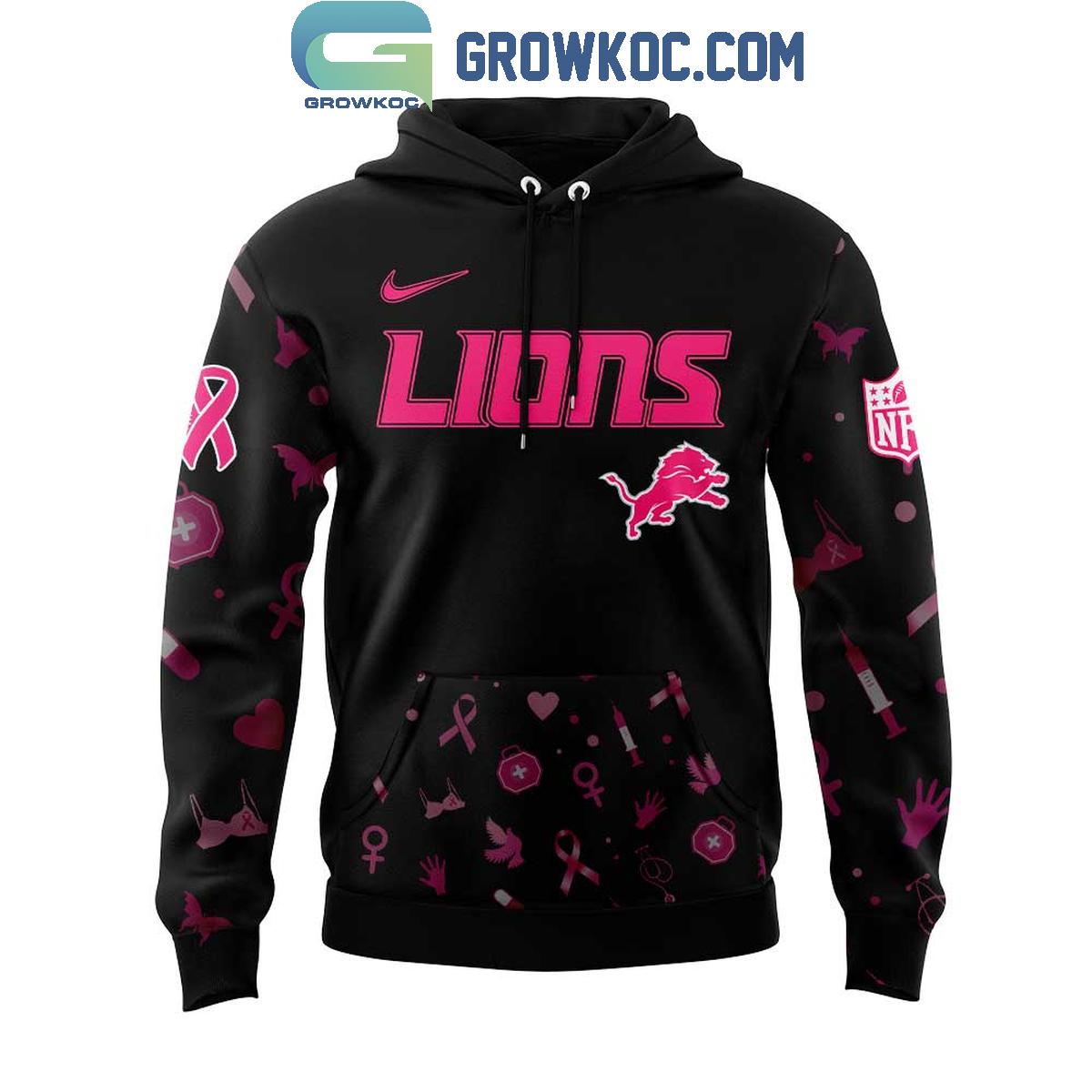 Crafted for dedicated Detroit Lions fans, the front of this striking black hoodie proudly displays "LIONS" in a vibrant pink hue, complemented by the iconic pink Detroit Lions leaping lion logo. Authenticity is evident with the subtle inclusion of both the Nike swoosh and the official NFL shield, signifying genuine team merchandise. The sleeves and lower body are adorned with an intricate pattern of various pink breast cancer awareness symbols, including ribbons, hearts, and medical motifs, creating a visually compelling tribute to the cause.