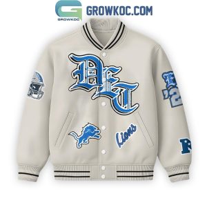 Meticulously crafted in a striking cream hue, this jacket proudly showcases bold Detroit Lions branding. The intricate Old English script features "DT" prominently on the front, while "Detroit" stretches across the back, both perfectly complemented by the iconic leaping lion logo. These details are not merely decorative; they are authentic emblems of your passion, rendered with precision and a nod to timeless design.