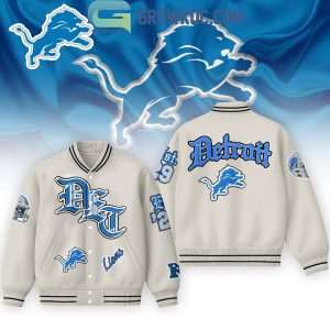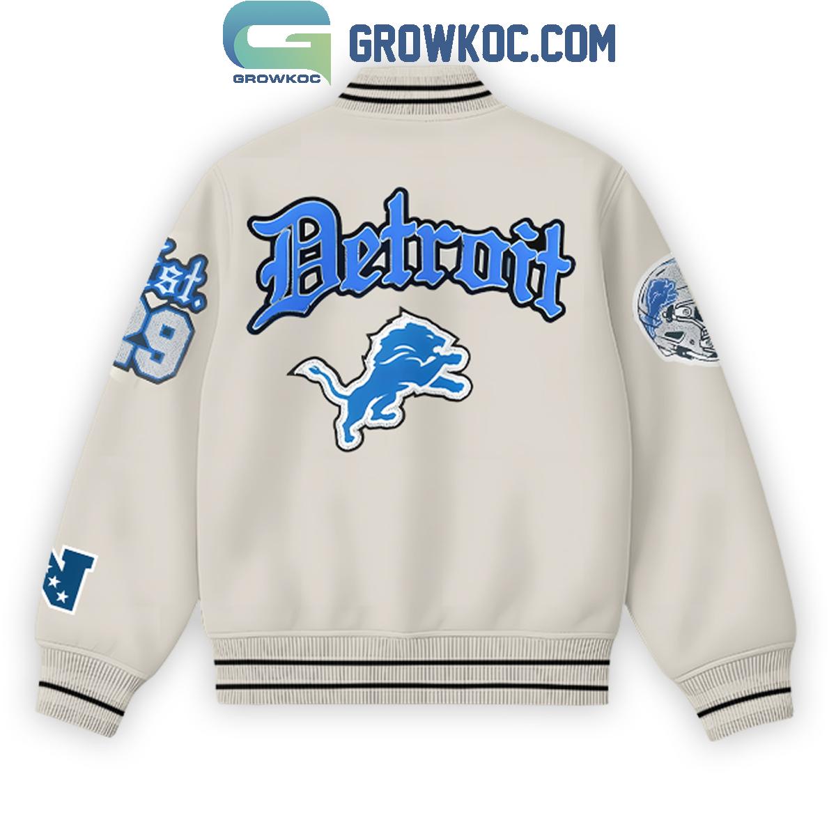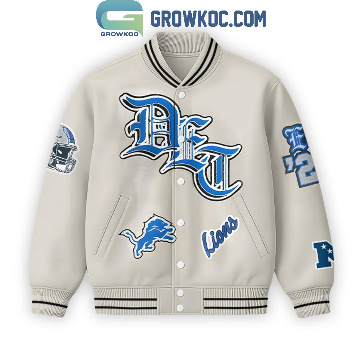 Meticulously crafted in a striking cream hue, this jacket proudly showcases bold Detroit Lions branding. The intricate Old English script features "DT" prominently on the front, while "Detroit" stretches across the back, both perfectly complemented by the iconic leaping lion logo. These details are not merely decorative; they are authentic emblems of your passion, rendered with precision and a nod to timeless design.