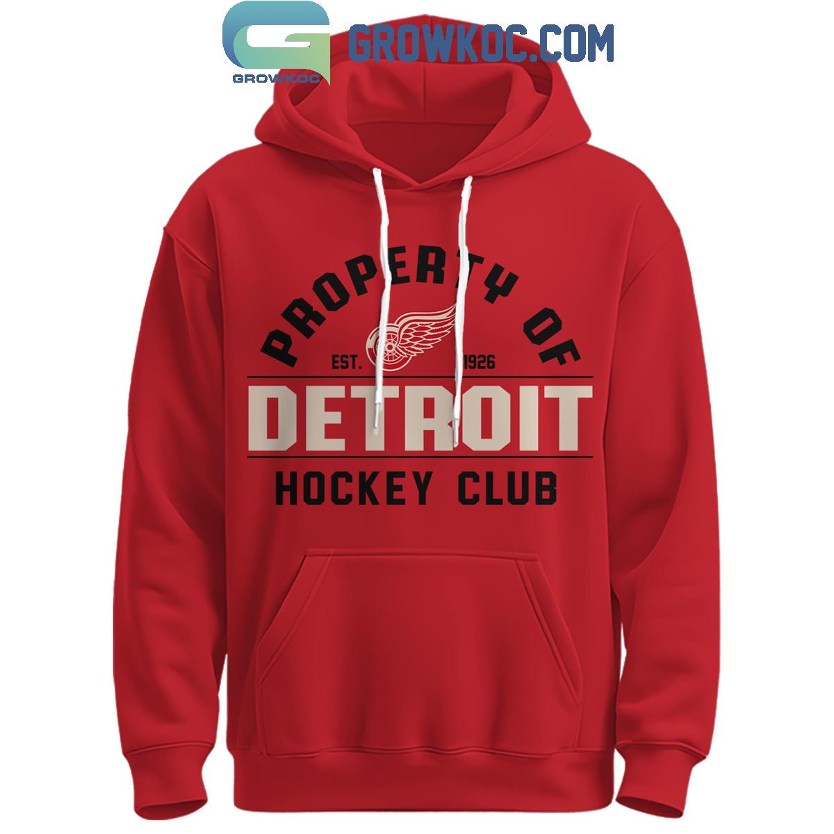 The vibrant, classic red fabric forms the perfect canvas for the iconic 'PROPERTY OF DETROIT HOCKEY CLUB' graphic, prominently displayed across the front. This design, complete with the revered winged wheel logo and the historically significant founding year 'EST. 1926', immediately signifies authenticity and a deep-rooted allegiance to a team built on generations of excellence. Beyond its striking visual appeal, this classic pullover design prioritizes fan comfort, featuring a cozy hood with adjustable drawstrings and a practical kangaroo pocket, ensuring superior warmth and ease whether you are cheering rinkside at Little Caesars Arena or enjoying the game from the comfort of your home.