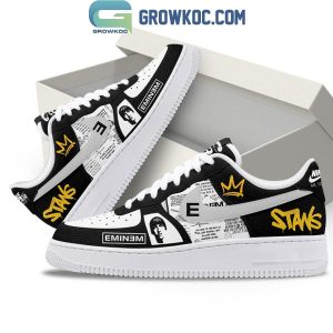 The design begins with a classic black and white foundation, featuring the signature perforated toe box and iconic sturdy sole that define the Air Force 1 silhouette. Vibrant yellow accents strategically highlight crucial details, including a bold "STANS" graphic proudly displayed on the heel and a distinctive crown motif, symbolizing Eminem's undisputed reign as the king of rap.