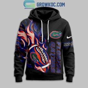 The front of this hoodie commands immediate attention with a football engulfed in dynamic blue and orange victory flames, powerfully symbolizing the team's relentless drive and fiery passion. The iconic Florida Gators logo is prominently featured on the chest, alongside bold vertical "Florida Gators" lettering, leaving no doubt about your team loyalty. Every detail is thoughtfully placed to project strength and commitment.