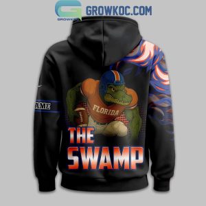 Turning to the back reveals a formidable Gator mascot, helmeted and poised for action, with "FLORIDA" emblazoned across its jersey. Below, "THE SWAMP" is displayed in powerful, iconic lettering, serving as a profound tribute to the legendary home field where champions are forged. The spirited flame motifs extend seamlessly onto the sleeves, ensuring a cohesive and dynamic aesthetic from every angle.