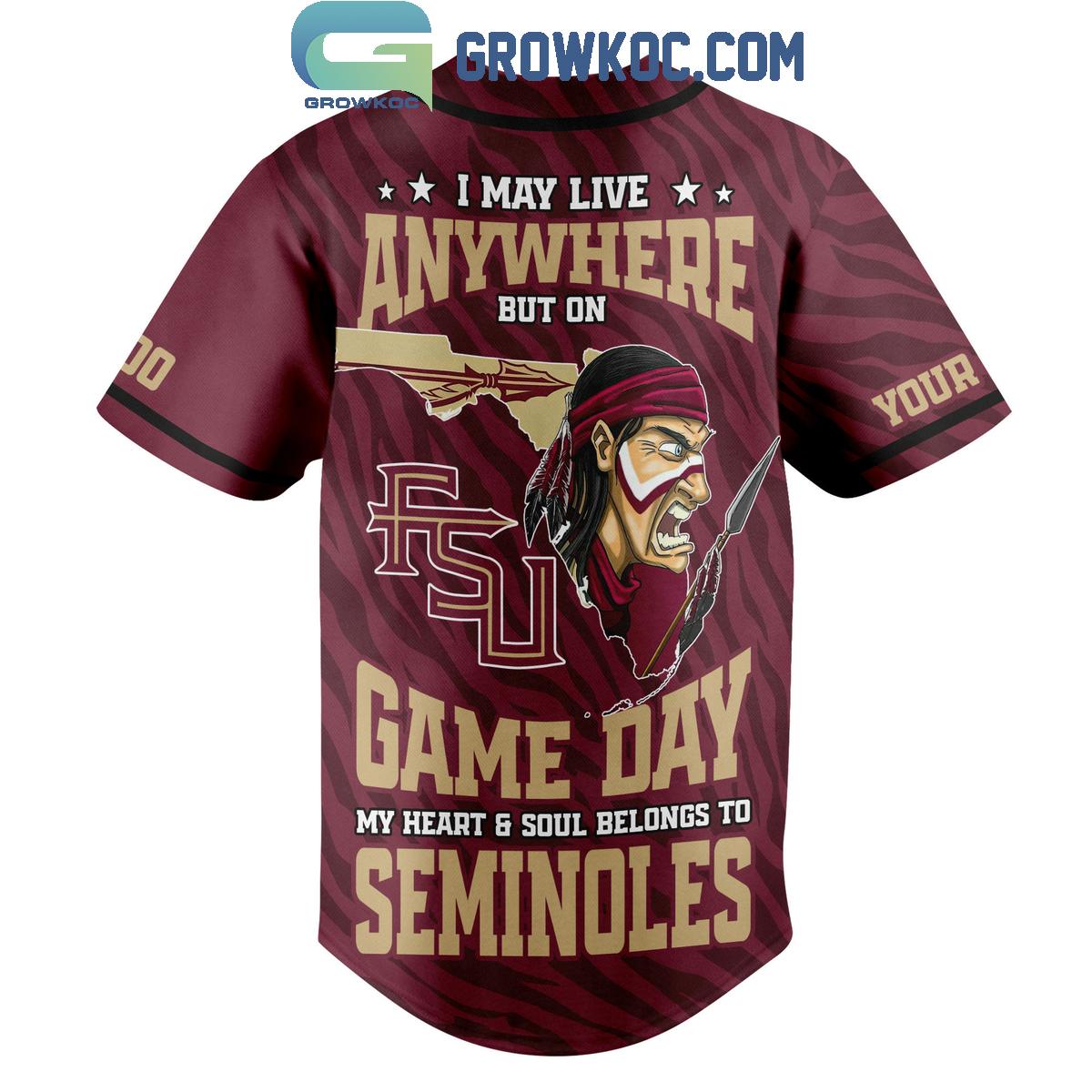 The design immediately commands attention, featuring striking Seminole warrior graphics on the front, underscored by prominent "SEMINOLES" lettering. This powerful imagery proudly showcases the strength and heritage associated with Florida State. Turning to the back, the jersey makes an even more personal declaration: "I May Live Anywhere But On Game Day My Heart & Soul Belongs To Seminoles." This heartfelt slogan is complemented by a dynamic FSU logo and an outline of the state of Florida, visually connecting your devotion to the team's roots. For a truly unique touch, fans can further personalize their jersey by adding their own name and preferred number, making it a distinct reflection of their individual commitment.