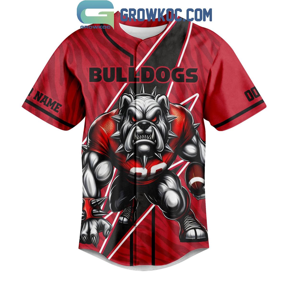 The front of this exceptional jersey makes an immediate statement, proudly displaying bold "BULLDOGS" lettering. This striking text is powerfully anchored by a fierce, muscular bulldog mascot, depicted ready for action. Its dynamic design, characterized by sharp black and red lines, creates a compelling visual impact, while designated areas for "YOUR NAME" and "YOUR NUMBER" offer a unique opportunity for personalized fan appeal, making it distinctly yours.