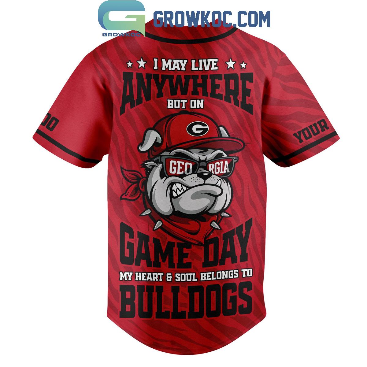 Turn heads and ignite conversations on game day with the jersey's remarkable back design. It features a cool bulldog sporting a "G" cap and stylish sunglasses, a symbol of laid-back confidence. This captivating graphic is paired with the resonant declaration: "I MAY LIVE ANYWHERE BUT ON GAME DAY MY HEART & SOUL BELONGS TO BULLDOGS." This powerful message authentically captures the deep-seated passion of every Georgia Bulldogs enthusiast.