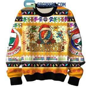 The front of the sweater proudly features the legendary Steal Your Face skull, playfully adorned with a Santa hat. It is surrounded by a joyful parade of colorful dancing bears, delicate snowflakes, and festive roses, all beneath the heartwarming "HAVE A GRATEFUL CHRISTMAS" greeting. This intricate design creates a visual feast for any dedicated Deadhead.