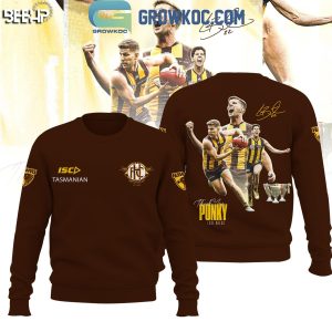The true centerpiece of this hoodie lies on the back, featuring a dynamic collage of Luke Breust in action, capturing his unmistakable prowess on the field. Below these powerful images, his well-known nickname 'The Mighty Punky' is emblazoned alongside his full name, a nod to his legendary status. A graphic representation of premiership cups further cements his incredible contribution to the Hawks' golden era.