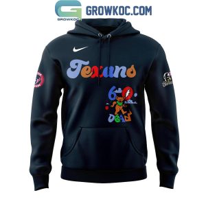 From an expert’s perspective on fan gear, the front of this dark navy hoodie immediately captures attention. The word "Texans" is rendered in a playful, multi-colored retro font, setting the tone for this special edition. Below it, a clever "60th Birthday" graphic incorporates a classic Grateful Dead dancing bear, signaling the core celebration of the band's milestone. A subtle Nike swoosh near the neckline indicates attention to contemporary athletic wear standards, alongside a practical kangaroo pocket and adjustable drawstrings.
