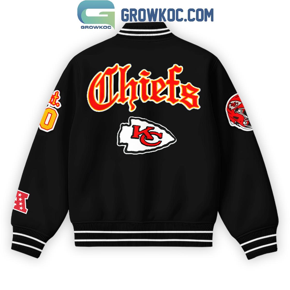 Beyond its striking visuals, the jacket is constructed for both comfort and a distinct retro aesthetic. It boasts a ribbed collar, cuffs, and hem, all accentuated by crisp white stripes, creating that authentic vintage varsity look. Contrasting white snap buttons secure the front, adding to its classic charm and ease of wear. This jacket is not merely apparel; it is a standout, essential addition to any discerning fan's collection, embodying both timeless style and an unwavering connection to the Kansas City Chiefs.