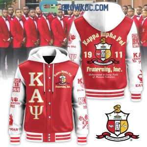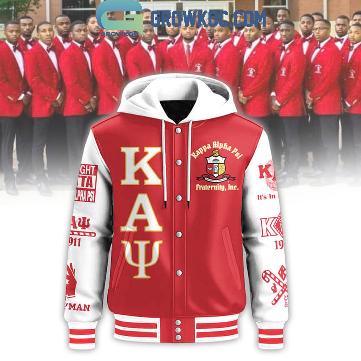 Crafted from premium materials, this jacket is both stylish and durable, making it perfect for fraternity events, casual outings, or as a meaningful keepsake. The ribbed cuffs, hem, and collar add a classic varsity touch, while the hoodie provides additional warmth and versatility. The sleeves are adorned with symbols and slogans unique to Kappa Alpha Psi, further emphasizing its rich history and values.