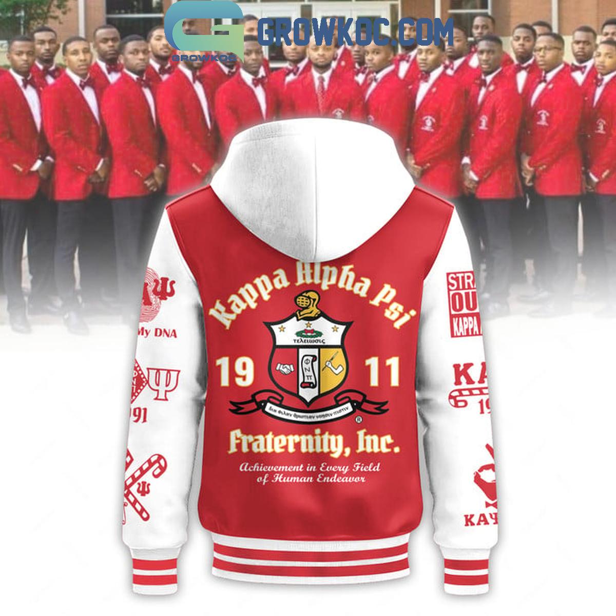 The Kappa Alpha Psi 1911 Achievement In Every Field Of Human Endeavor Baseball Jacket is a standout piece that proudly represents the legacy and values of Kappa Alpha Psi Fraternity, Inc. This varsity-style jacket features a bold red and white color scheme, accented with detailed embroidery of the fraternity’s Greek letters “???” on the front and the iconic crest and motto on the back. The design also highlights the founding year, 1911, and the fraternity?s commitment to “Achievement in Every Field of Human Endeavor.”