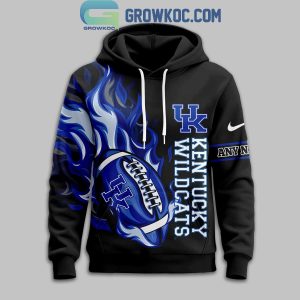 The front of this striking hoodie commands attention with vibrant blue flame graphics, creating an energetic backdrop. Centered prominently is a Kentucky Wildcats football graphic, distinctly emblazoned with the iconic UK logo, symbolizing the team's relentless drive. Vertically oriented "KENTUCKY WILDCATS" text proudly runs down the side, leaving no doubt about your unwavering allegiance.