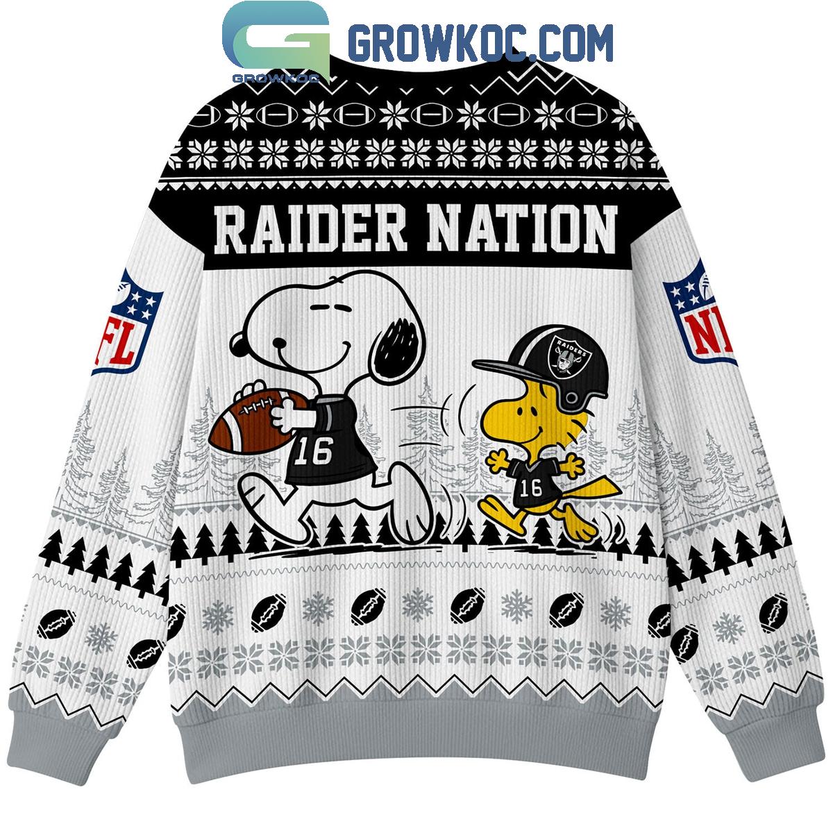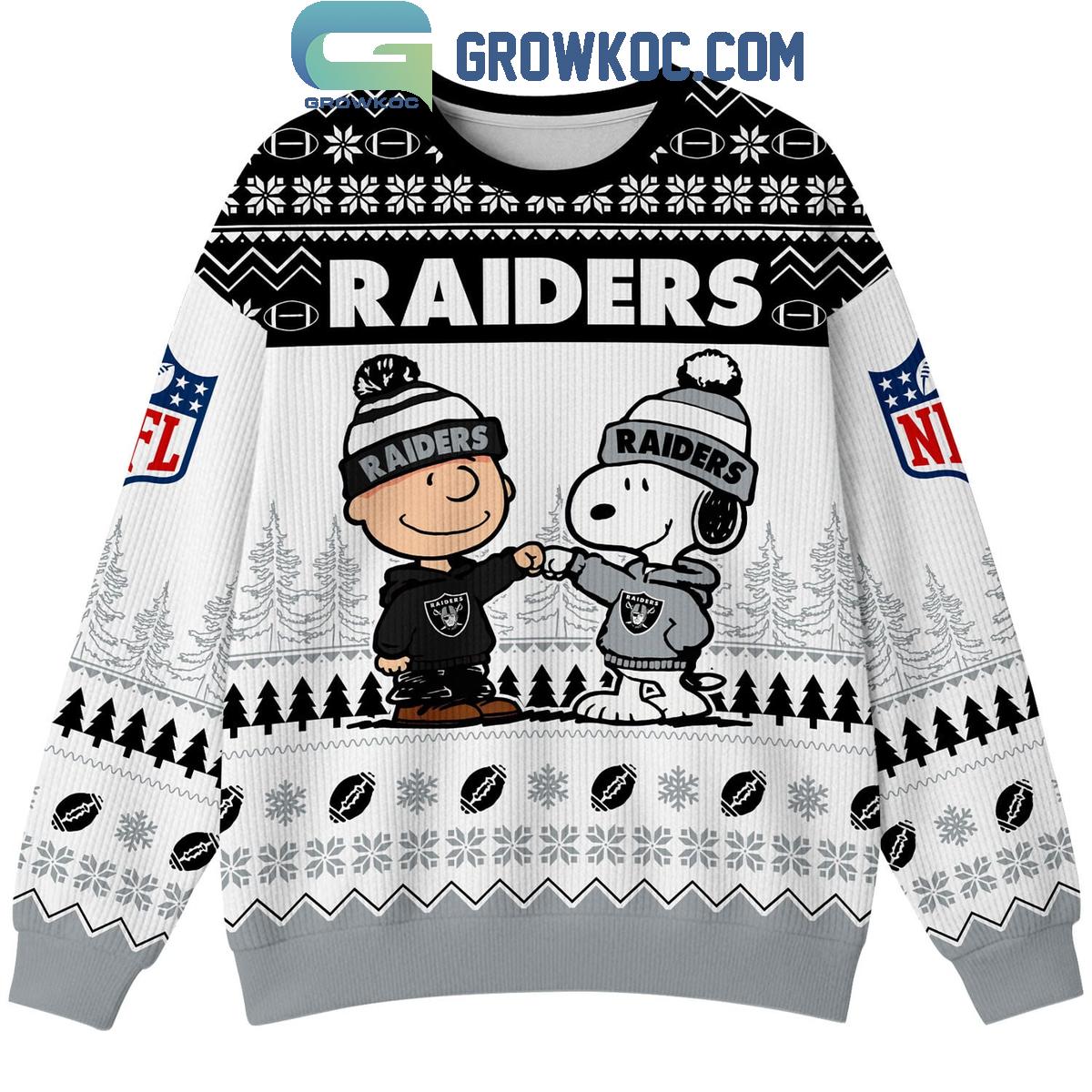 This ugly Christmas sweater showcases a premium all-over knit-style print with classic winter elements such as snowflakes, football patterns, and evergreen trees, all seamlessly blended with the Raiders’ legendary black, silver, and white color scheme. The front design highlights Snoopy and Charlie Brown sharing a celebratory fist bump in Raiders outfits, symbolizing unity and unwavering fan loyalty. The back artwork adds dynamic energy with Snoopy and Woodstock in motion, while bold “Raider Nation” lettering across the shoulders makes a powerful statement that every Raiders fan will appreciate. NFL-inspired sleeve details complete the authentic football aesthetic.