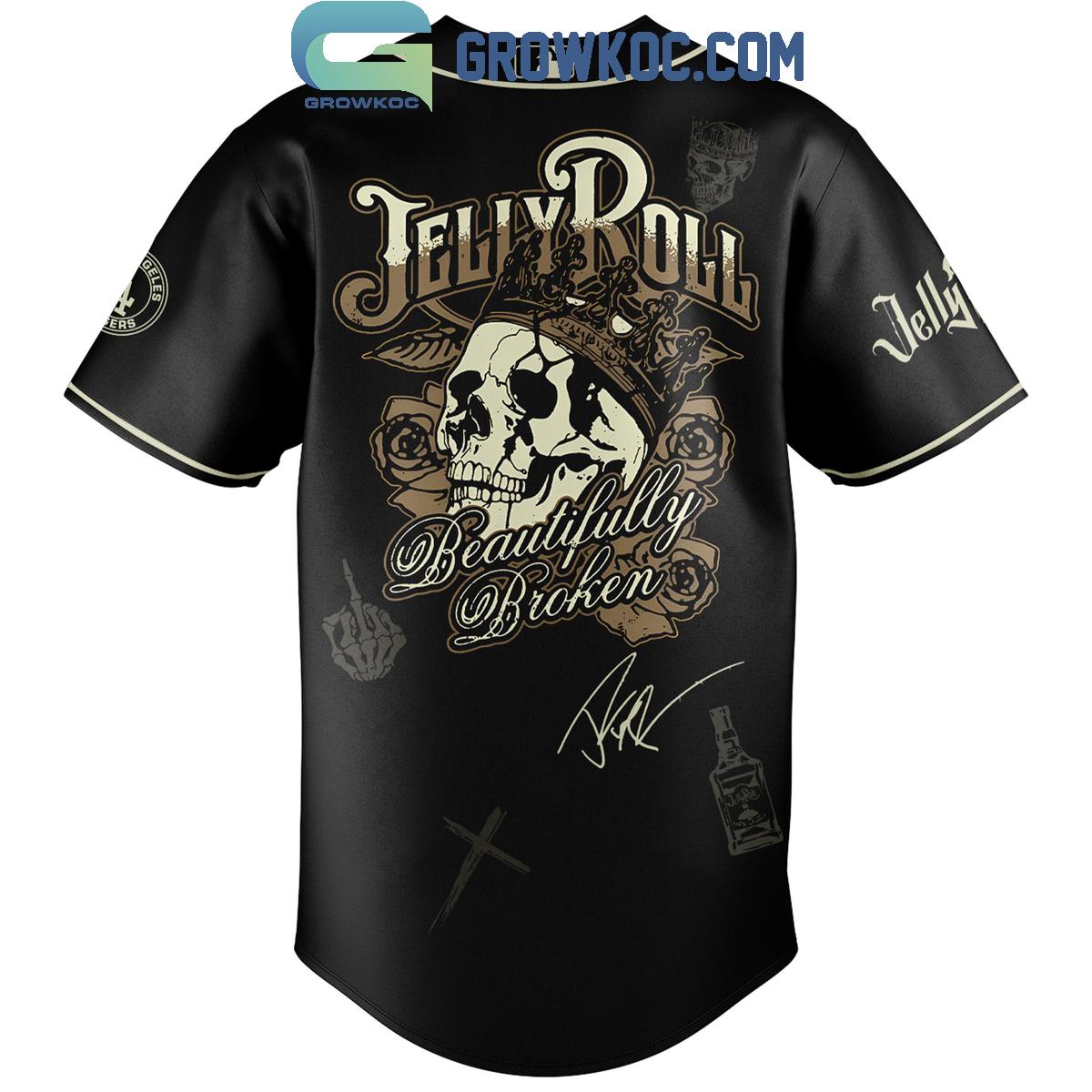 The front of the jersey proudly displays the classic Dodgers script logo with the LA emblem, accented by subtle tour-inspired details like crosses, guitar graphics, and Jelly Roll’s signature logo. On the back, the jersey features a stunning skull and roses artwork with the “Beautifully Broken” banner, along with Jelly Roll’s autograph print, capturing the spirit of his heartfelt music and gritty style.
