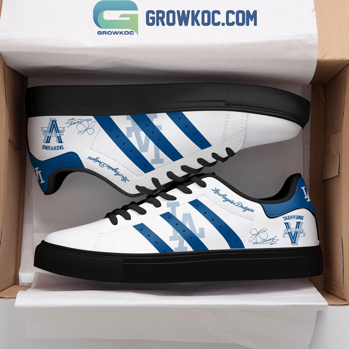 Further detailing highlights the unique collaboration. The heel tab, in a striking blue, proudly displays "TAEHYUNG" (V's given name), alongside the distinctive "V BTS V's CLUB" emblem on one shoe and the classic "LA" Dodgers insignia on the other. A subtle, signature-like graphic graces the side panel, adding an authentic touch for dedicated fans. The overall aesthetic is a thoughtful homage to two powerful cultural entities.