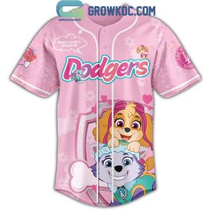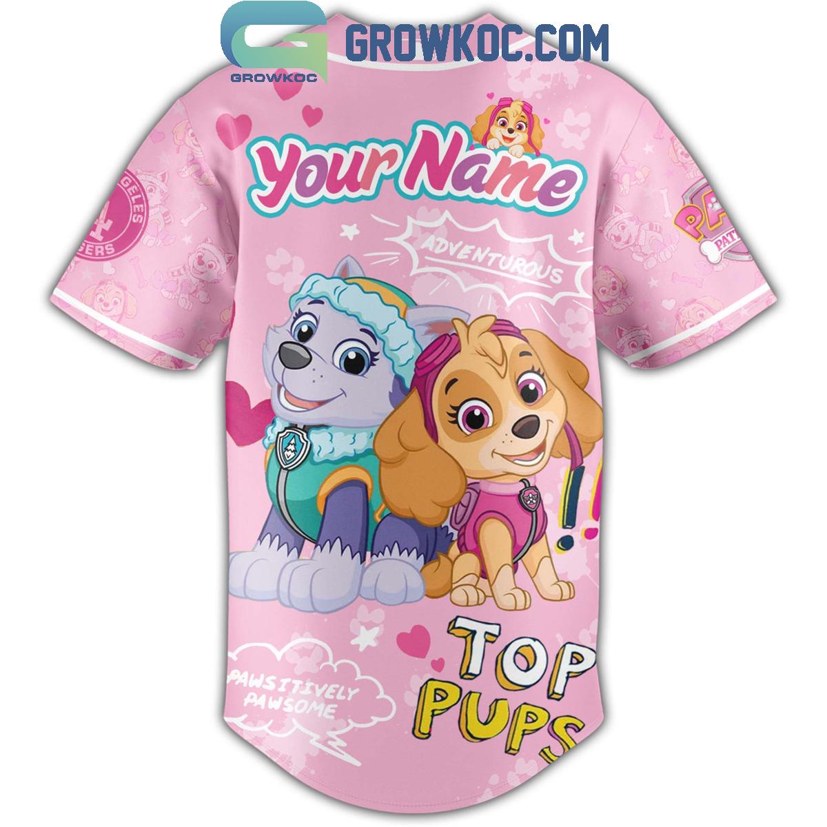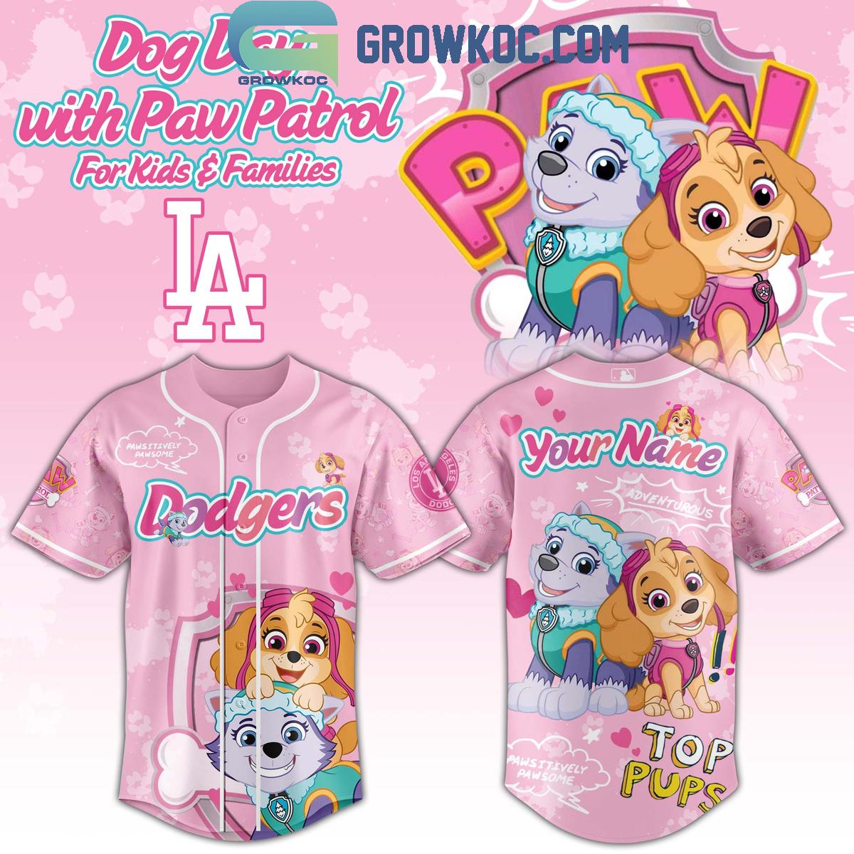 Adorned in a vibrant pink hue, the jersey proudly displays the iconic Los Angeles Dodgers script logo across the chest. Playfully integrated beneath are instantly recognizable Paw Patrol characters, including the spirited Skye and the adventurous Everest, embodying the show's themes of courage and friendship. Further details like "Pawsitively Pawsome" text and subtle paw print and heart patterns enhance the whimsical, family-friendly design on the front.