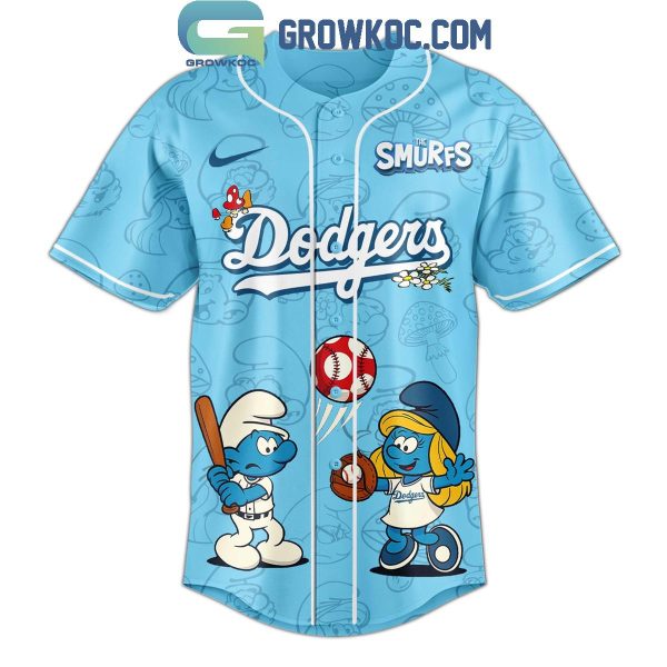 Designed in a vibrant sky-blue color, this jersey features an all-over Smurf-themed pattern with baseball-ready characters like Papa Smurf and Smurfette in Dodgers uniforms. On the front, the classic Dodgers script logo is creatively paired with Smurfs branding and cute animated elements like a flying baseball and mushrooms. The back continues the fun with a large “The Smurfs” logo, a giant LA logo, and a slugger Smurf holding a bat under a red-spotted mushroom.