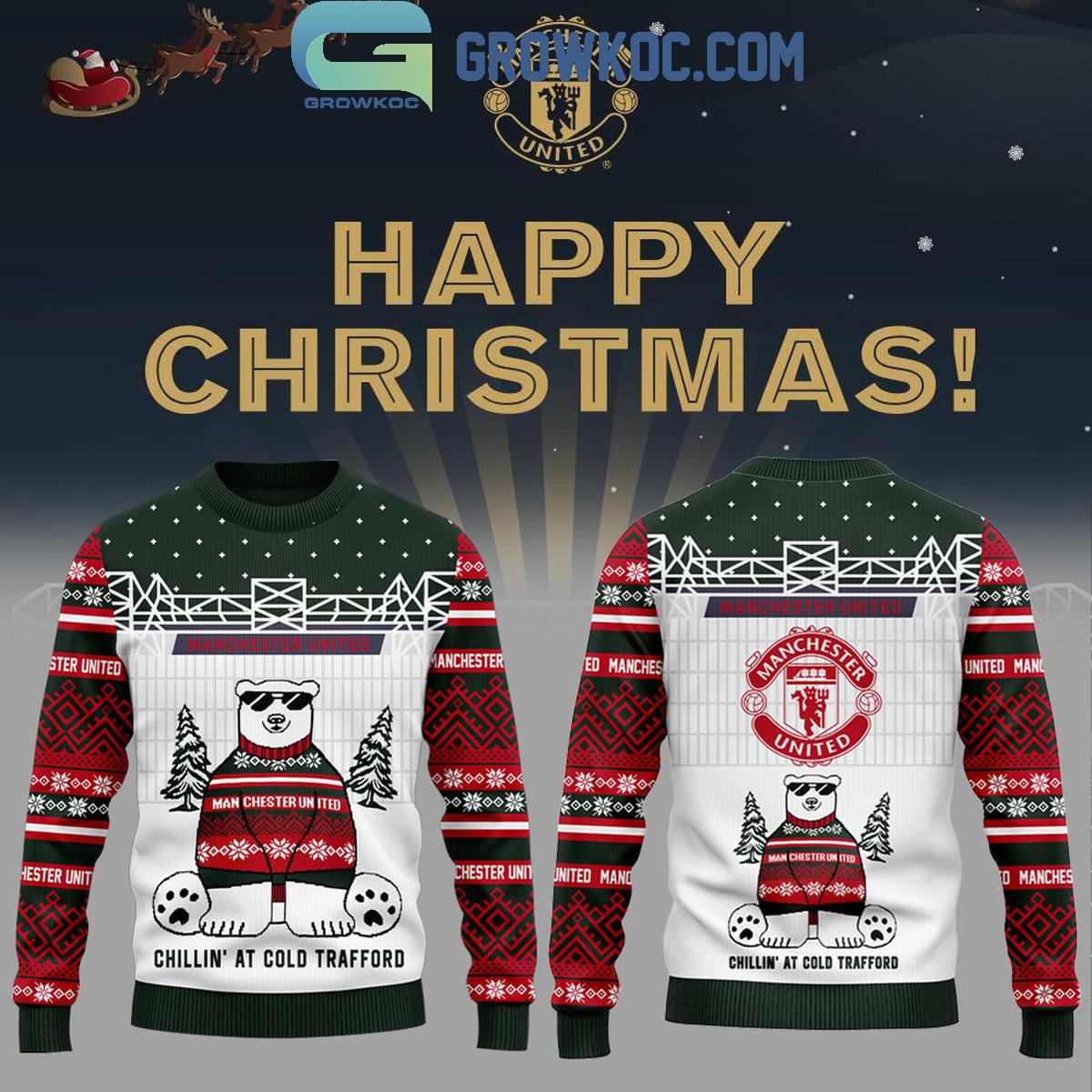 On the back, the design proudly displays the Manchester United crest, along with a second polar bear illustration in full Christmas style. The message “Chillin’ at Old Trafford” adds the perfect finishing touch—fun, playful, and full of club personality.