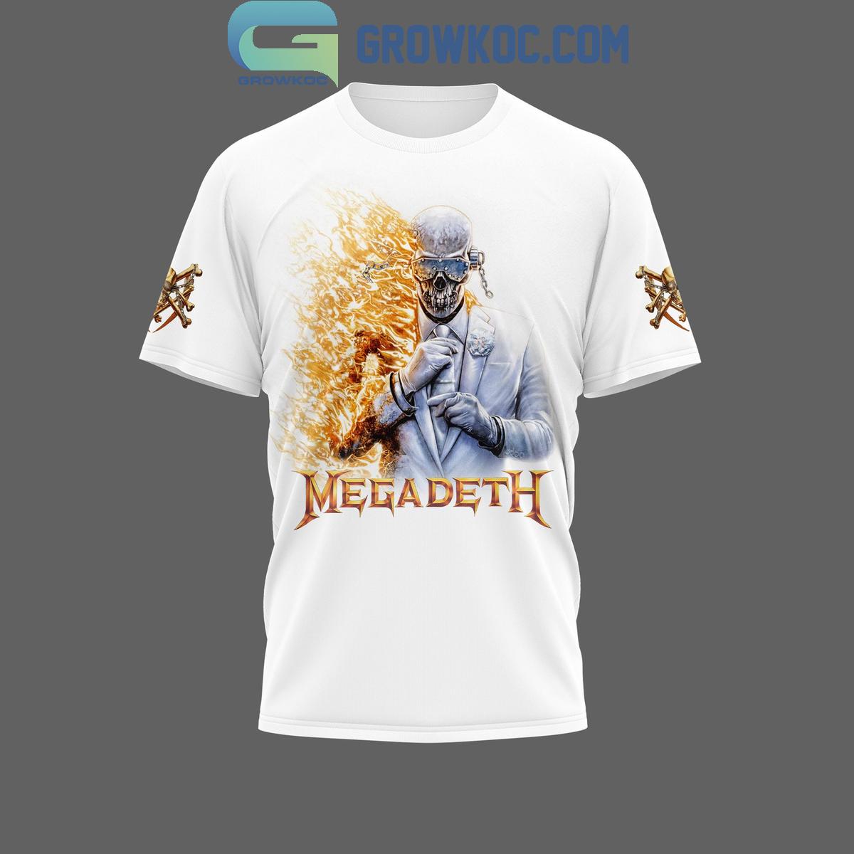 The front of this striking tee prominently features Vic Rattlehead, Megadeth's enduring mascot, rendered in a sharp suit and half-engulfed in fierce, chaotic flames. This powerful visual spectacle of impending disorder is underscored by the instantly recognizable Megadeth logo, boldly asserting the shirt's authentic heavy metal pedigree and the band's unwavering identity.