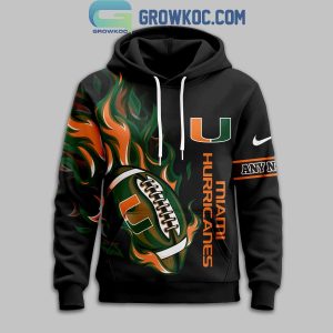 The hoodie's front proudly showcases the iconic "U" logo, dynamically intertwined with a football and vibrant orange and green flame graphics. These elements powerfully symbolize the Hurricanes' burning drive and relentless pursuit of victory. Bold "Miami Hurricanes" lettering runs vertically alongside, leaving absolutely no doubt about your steadfast allegiance to The U, making a clear statement to fellow fans and rivals alike.