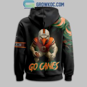 Turn heads with the equally powerful back design, which features a determined Miami mascot in full football gear, poised and ready for action. The rallying cry "GO CANES" is emblazoned prominently below, surrounded by matching fiery accents that boldly extend up the sleeves. This comprehensive design ensures your unwavering team pride is showcased from every angle, broadcasting your loyalty with undeniable energy and style.