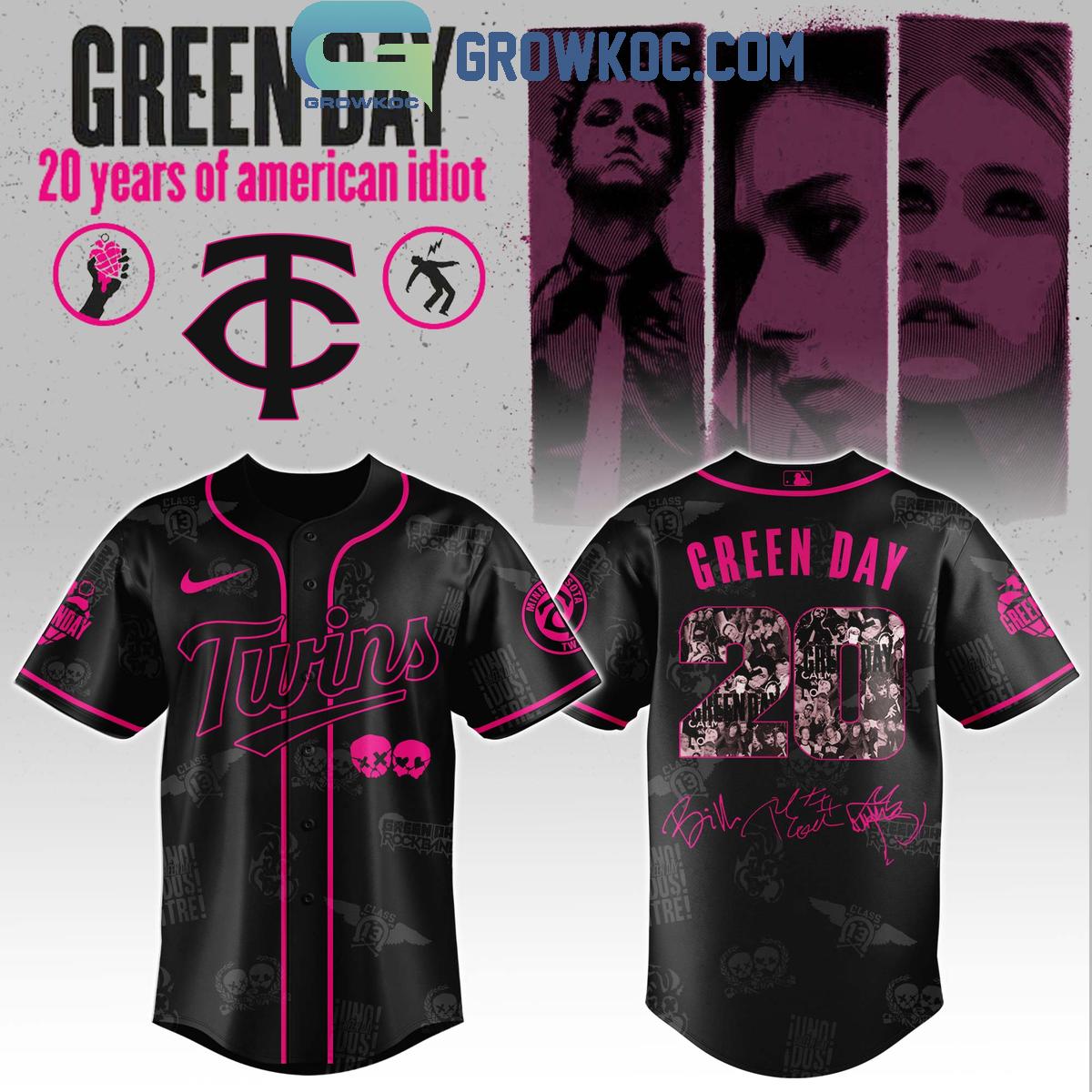 The Minnesota Twins x Green Day 20 Years of American Idiot 2025 Jersey is a bold, limited-edition collaboration that celebrates two decades of Green Day’s legendary album American Idiot. Featuring a jet-black base with vibrant hot pink accents, this exclusive jersey fuses the energy of MLB style with the rebellious spirit of punk rock.