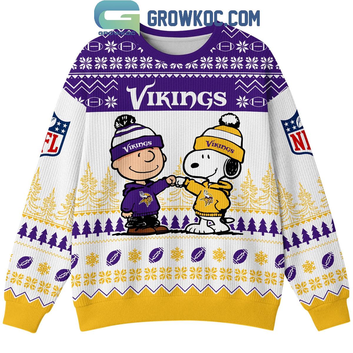 Designed with a premium all-over knit-style print, this sweater blends traditional ugly sweater elements such as snowflakes, football motifs, and winter forest patterns with the Minnesota Vikings’ signature purple, gold, and white color scheme. The front artwork highlights Snoopy and Charlie Brown sharing a celebratory fist bump in Vikings outfits, symbolizing unity, teamwork, and loyal fan spirit. On the back, Snoopy and Woodstock appear in playful motion, adding energy and personality, while bold “Skol Vikings” lettering across the shoulders makes the design instantly recognizable. NFL-inspired sleeve details complete the authentic football look.