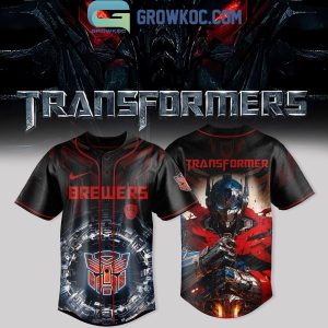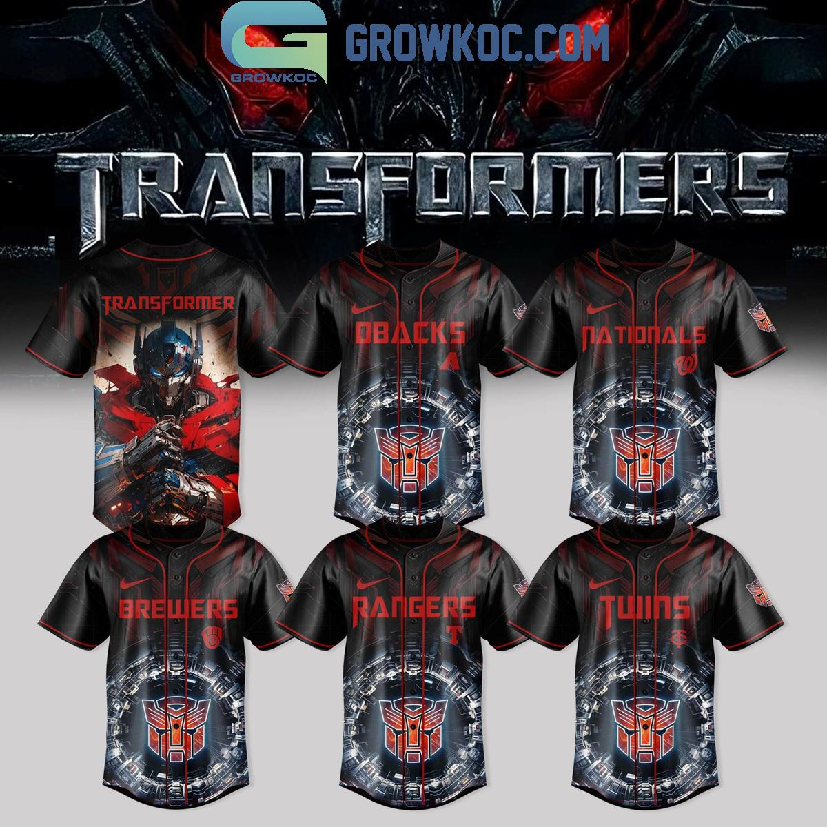 The front features the iconic Autobot logo in a sleek mechanical design, surrounded by intricate cybernetic patterns that give a futuristic vibe. MLB team names and logos, including the D-backs, Nationals, Brewers, Rangers, and Twins, are proudly displayed, letting fans show their team spirit with a unique twist. The back showcases a stunning full-color illustration of Optimus Prime in a powerful pose, making this jersey a standout piece in any collection.