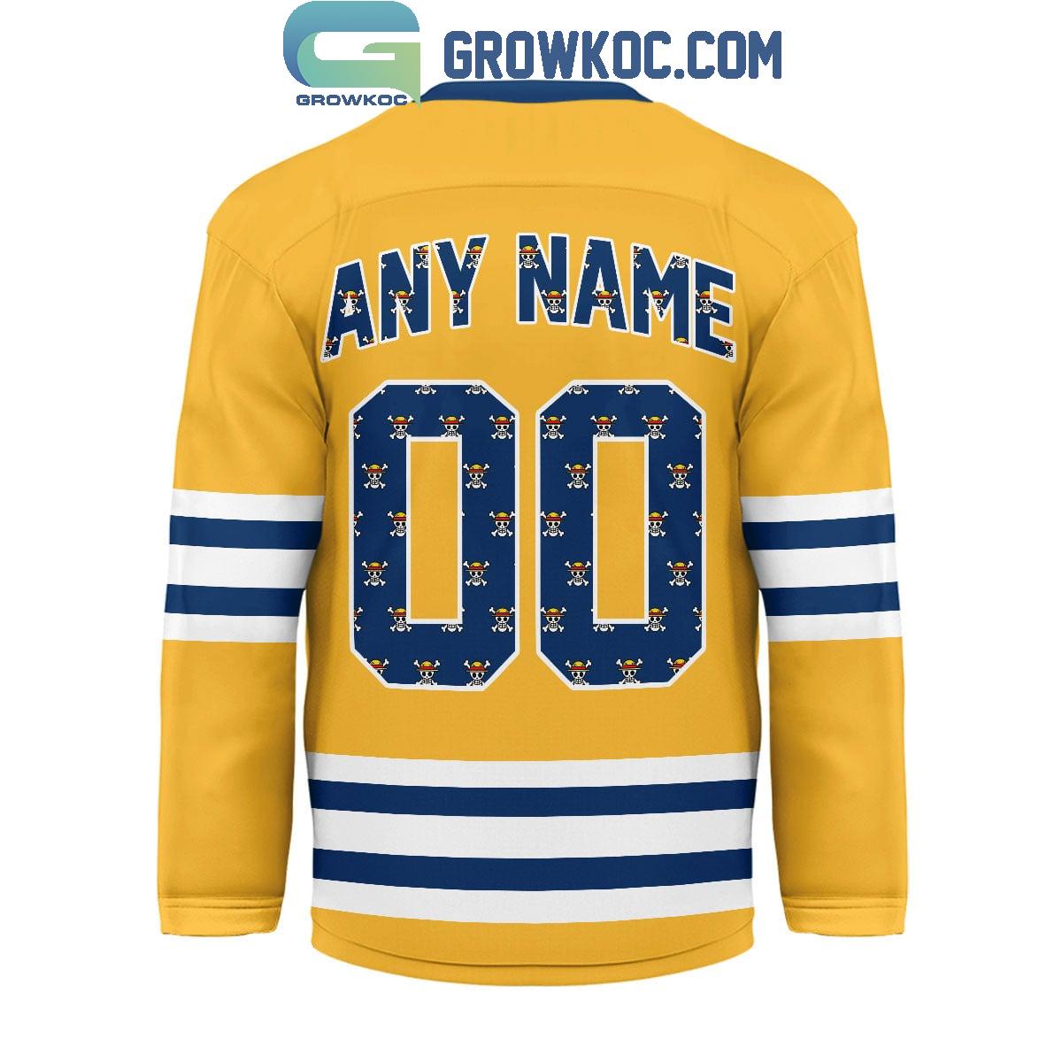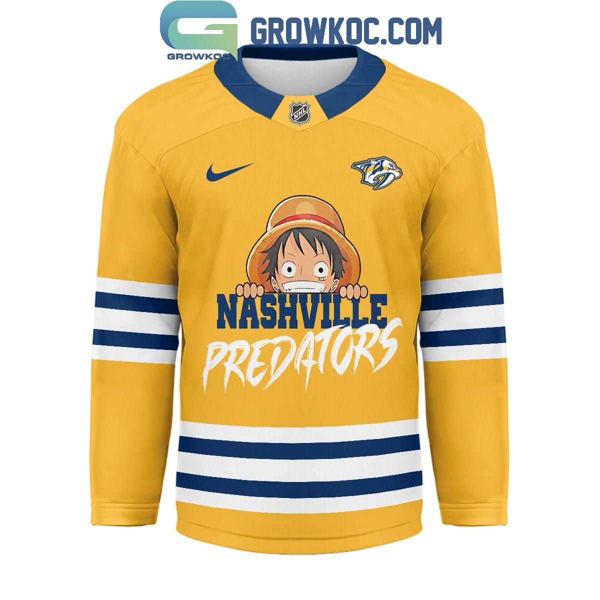 This is the Nashville Predators x One Piece Hockey Jersey, a unique crossover for fans who love both the intensity of NHL action and the adventurous spirit of the Straw Hat Pirates. It’s ideal for supporters looking to showcase their dual passions in a bold and distinctive way.