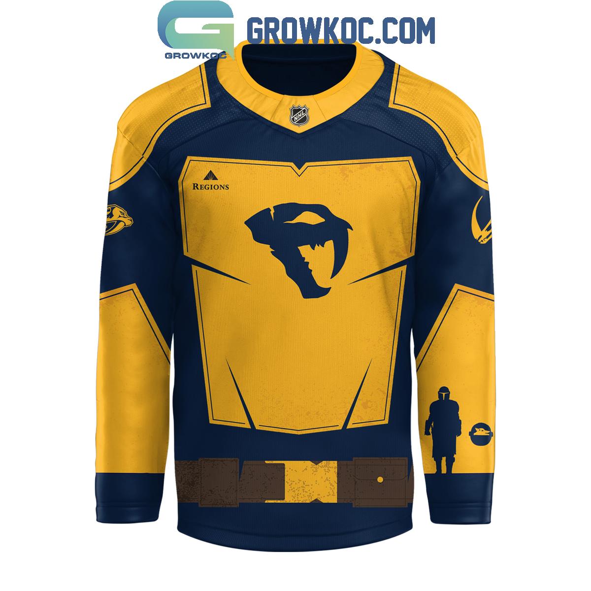 Crafted in the signature navy blue and vibrant Predators gold, the jersey's front immediately captures attention. The iconic saber-tooth tiger emblem is dramatically re-imagined, set against a striking gold, Mandalorian-inspired chest plate design, complete with subtle, authentic armor paneling. The official NHL shield and a "Regions" sponsor patch are prominently displayed, affirming its authenticity and professional quality.