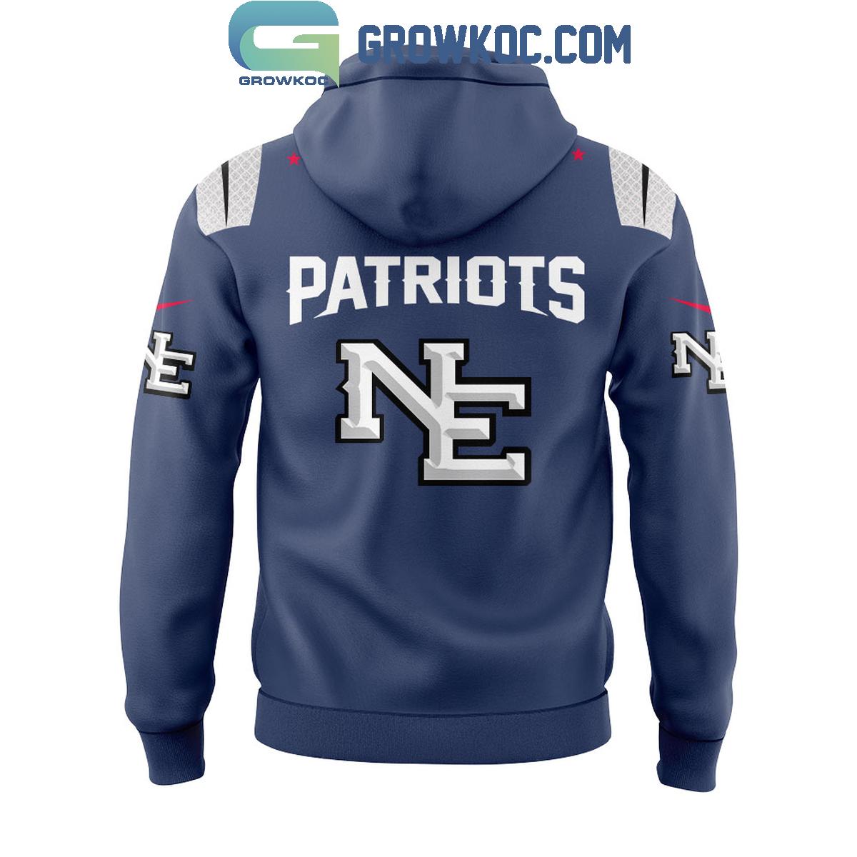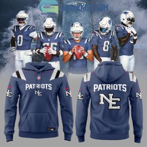 Turn around, and the commitment to team identity continues. The back proudly features "PATRIOTS" and the "NE" emblem, ensuring your loyalty is visible from every angle. The sleeves carry additional "NE" markings, reinforcing the unmistakable New England branding. A practical kangaroo pocket offers warmth for your hands or convenient storage for small essentials, while the hood with drawstrings provides adjustable coverage.
