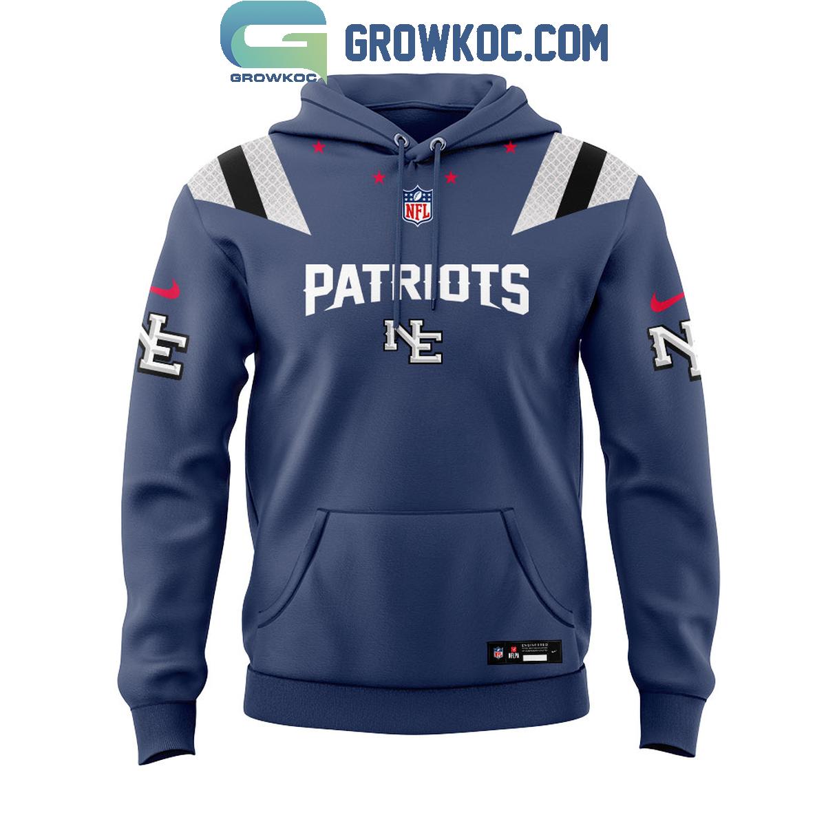 The front of this premium hoodie immediately captures attention with the bold "PATRIOTS" lettering, accompanied by the iconic "NE" logo, signifying your deep connection to the team. Above, the official NFL shield adds a touch of authenticity, while a subtle Nike swoosh on the chest confirms its quality. Unique white and black striped shoulder panels evoke the gridiron, complemented by five small red stars, perhaps a nod to championship victories or patriotic pride.