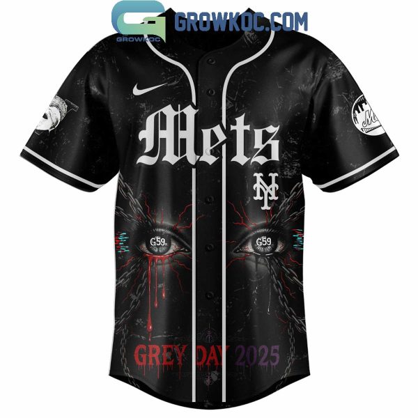 The front of the jersey features the classic Mets name in gothic lettering with bold NY logos, surrounded by glitch-like graphics and G59-branded eyes that pulse with eerie red lightning. At the bottom, the “Grey Day 2025” inscription leaves no question about the inspiration behind this bold design.
