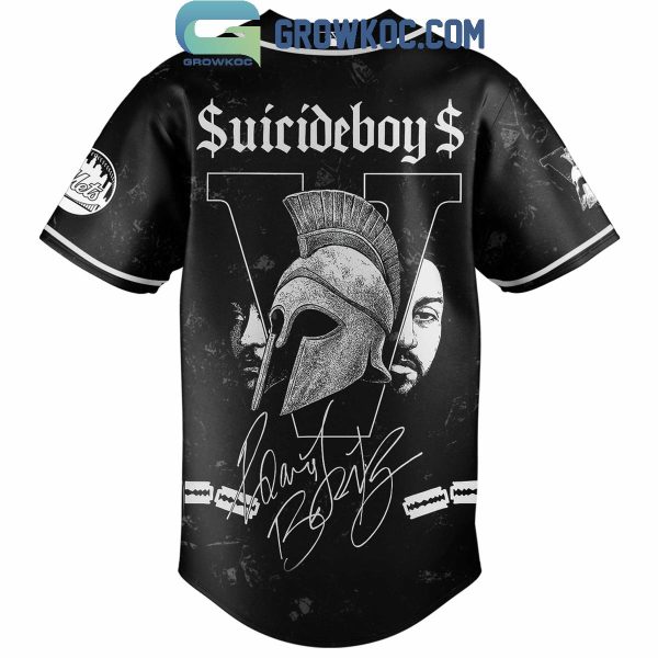 Turn it over and get hit with full force—$uicideboy$ branding sits atop a massive Roman warrior helmet and grayscale portraits of the rap duo, set against a giant “V” symbolizing power and defiance. The printed autograph gives this piece collector-level status, while the gritty grayscale palette reflects the haunting aesthetic of the Grey Day sound.