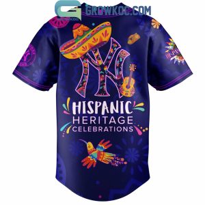 On the back, a vibrant oversized interlocking NY logo is surrounded by celebratory icons and the phrase “Hispanic Heritage Celebrations.” The jersey’s lively artwork perfectly captures the joy and richness of Latin culture, making it a standout piece for both baseball fans and cultural advocates.